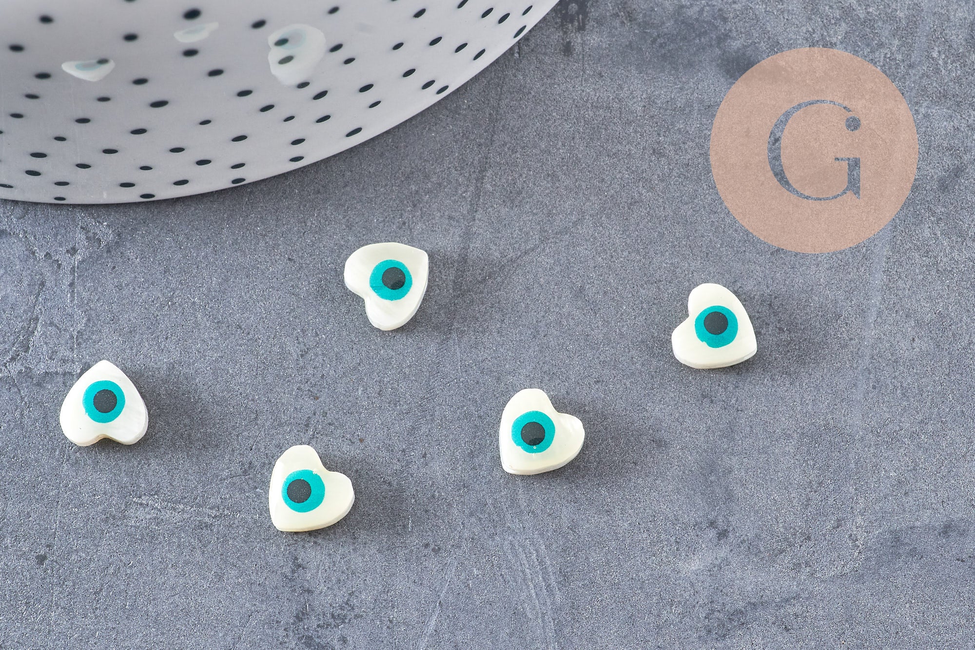 Para personalizar sus joyas y otros accesorios textiles o de piel suave, opte por este juego de 10 cabujones de nácar blanco que representan el ojo de la suerte.