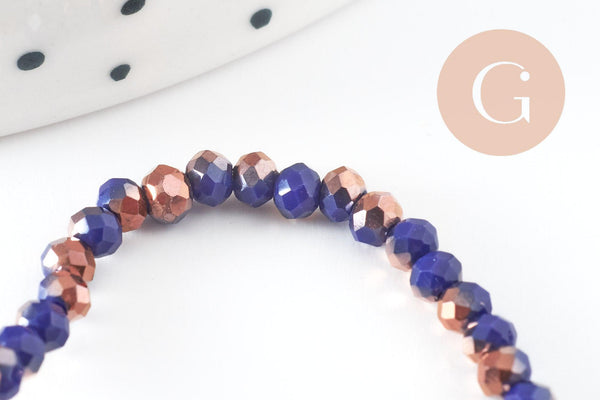 Realza tus creaciones con este hilo de cuentas de ábaco en cristal facetado azul y dorado . Cada perla, delicadamente tallada, ofrece un juego de luz único que mezcla reflejos azul profundo y toques dorados brillantes.
