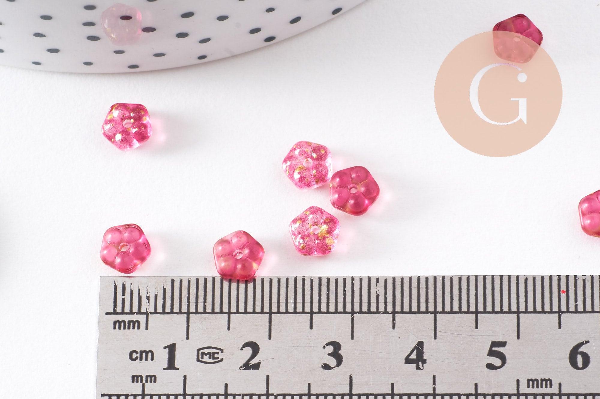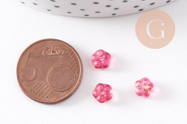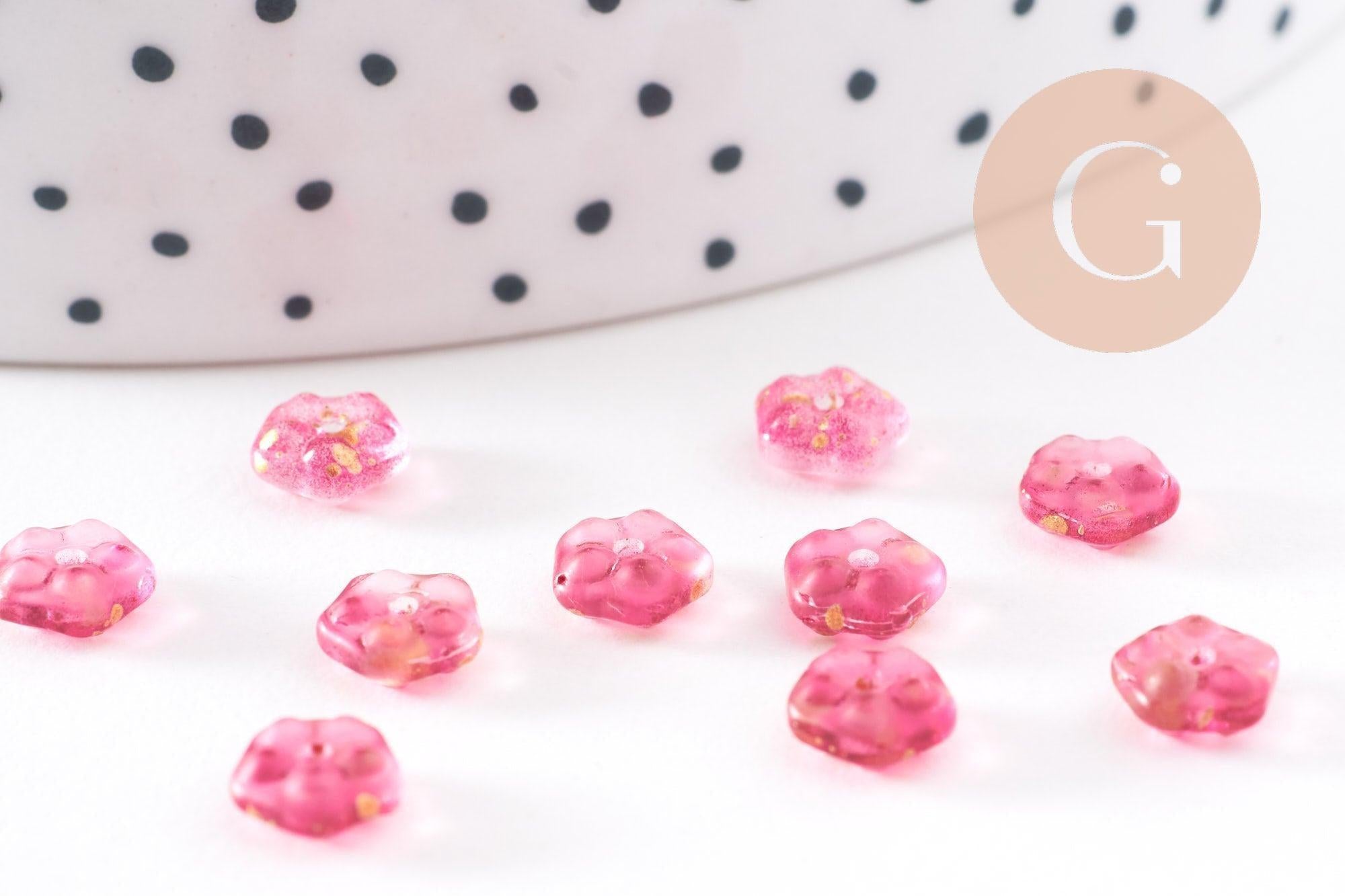 Añade un toque floral y luminoso a tus creaciones con estas preciosas cuentas de cristal checo en forma de flor , delicadamente pintadas en tonos rojo-violeta realzados con detalles dorados .