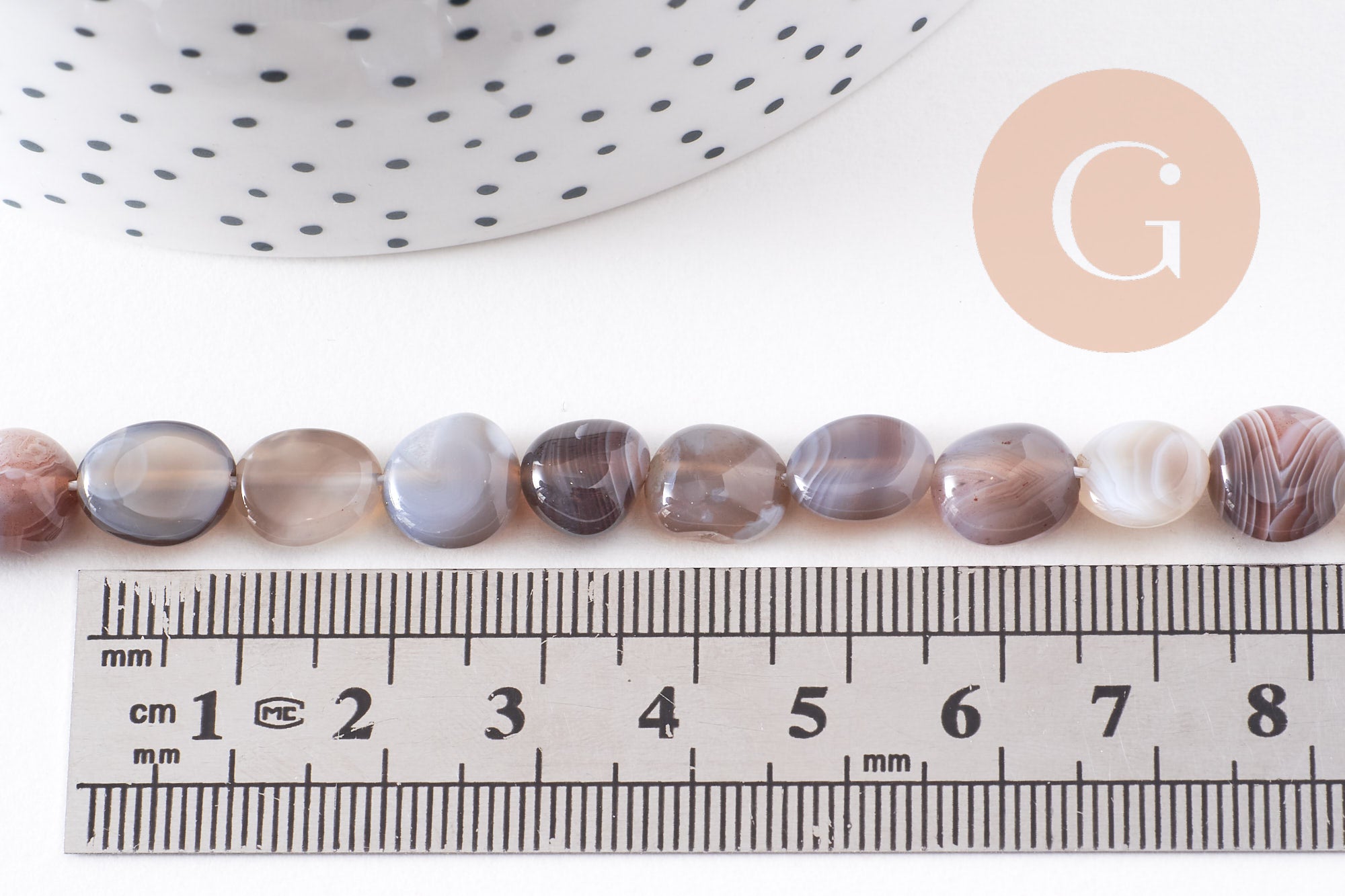 Una tira de cuentas redondas de ágata de Botsuana con rayas en tonos beige, gris y marrón.