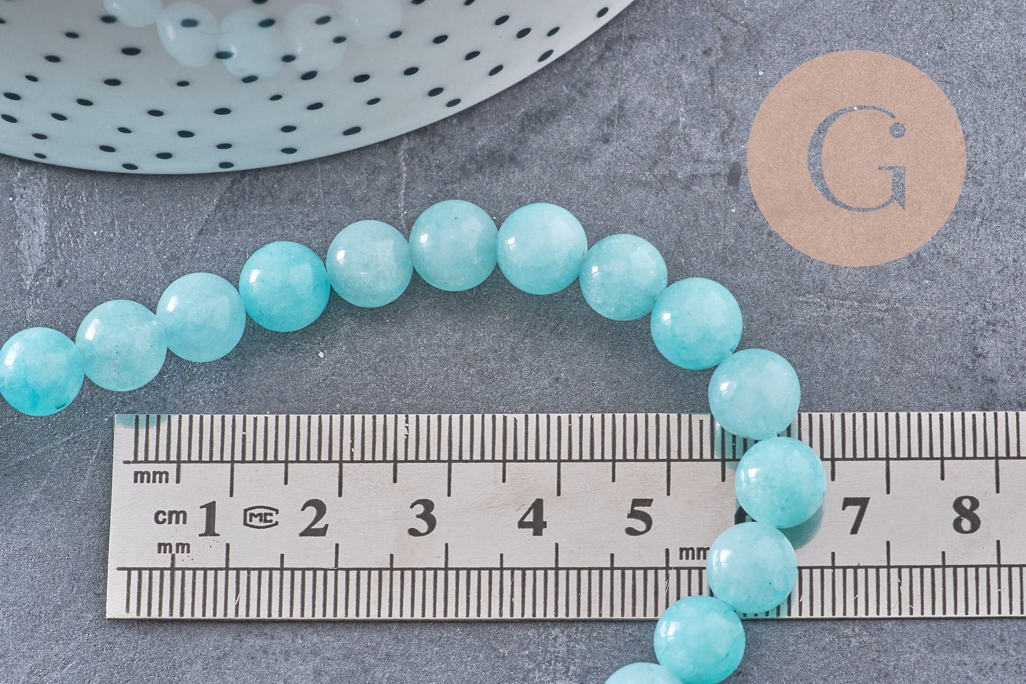 aproximadamente 44 cuentas redondas de jade teñido, imitación amazonita, en magníficos tonos que van del verde claro al turquesa veteado.