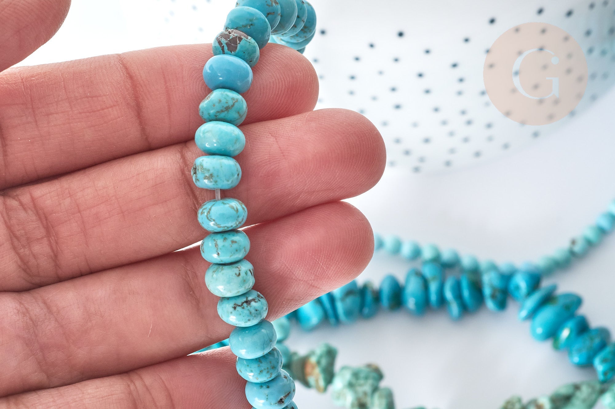Estas cuentas de joyería de howlita teñidas de forma natural te permitirán crear joyas únicas y originales. Son de color azul turquesa y las formas disponibles son pepitas, arandelas o cuentas redondas.