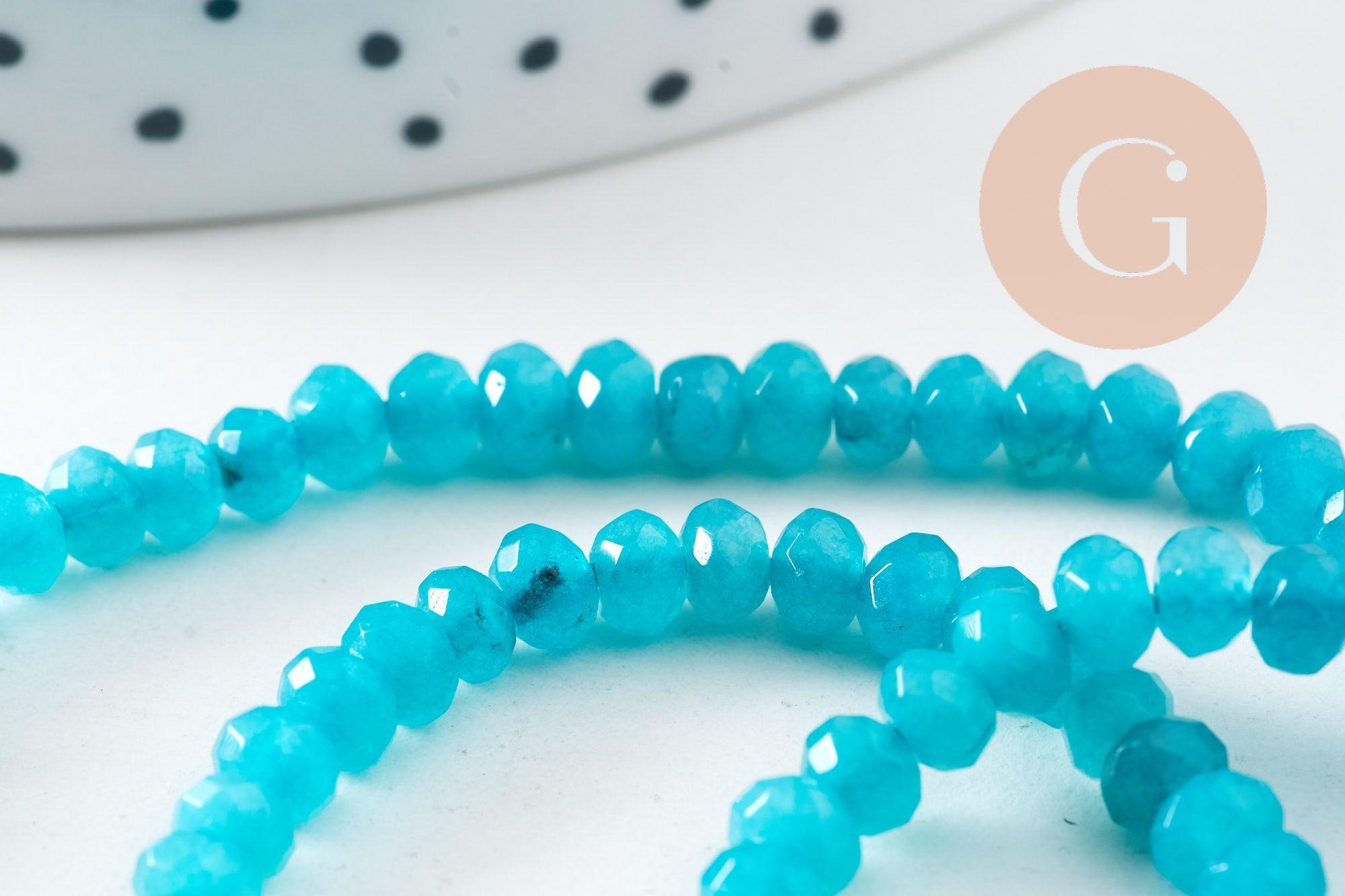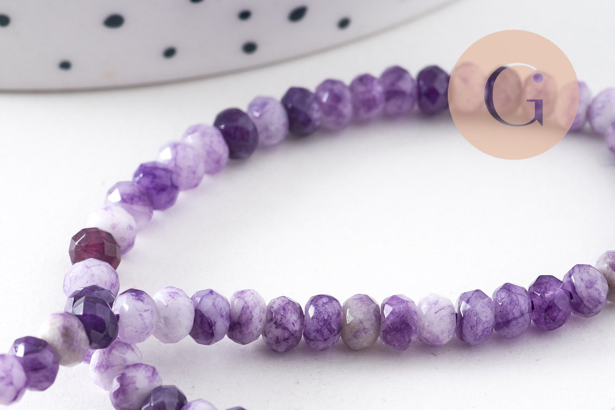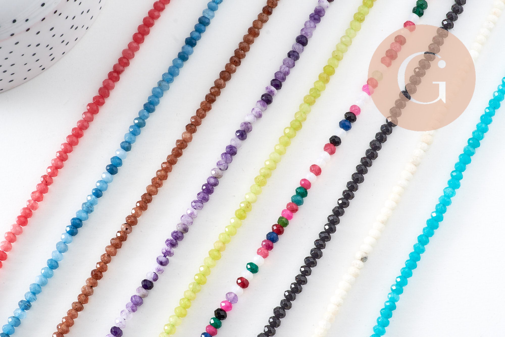 Realza tus creaciones de joyería con estas cuentas facetadas en forma de rondel de jade natural teñido , disponibles en una magnífica gama de colores: negro, rosa, verde amarillento, turquesa, morado, azul, gris beige, marfil o multicolor.