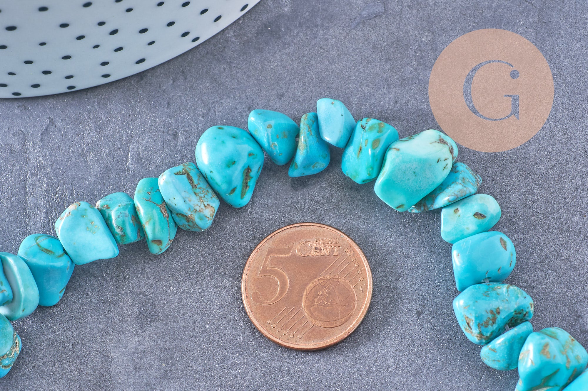 Crea joyería bohemia y natural con esta tira de cuentas de turquesa sintética . Cada cuenta irregular aporta textura y autenticidad a tus creaciones. Una alternativa asequible a la turquesa natural, que conserva su encanto mineral.