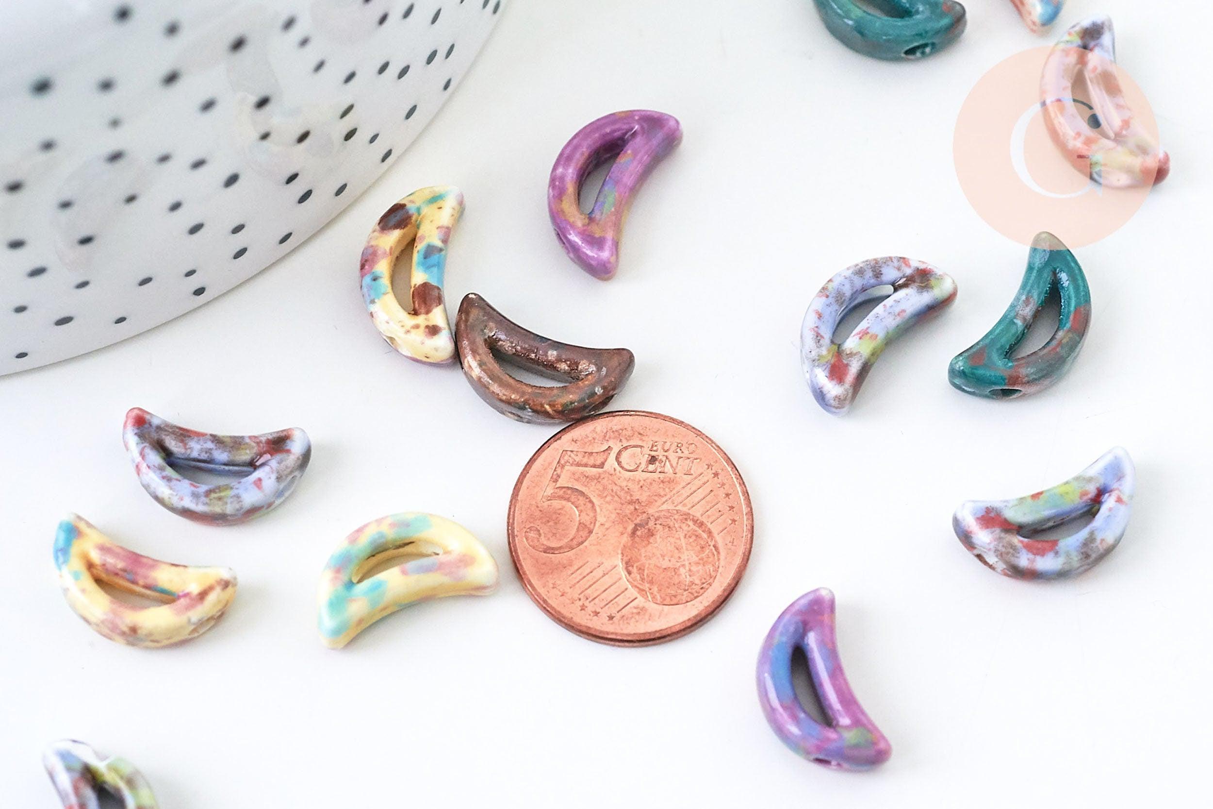 Perles en porcelaine lune 16mm émail multicolore, création bijoux porcelaine céramique, x5 G5649