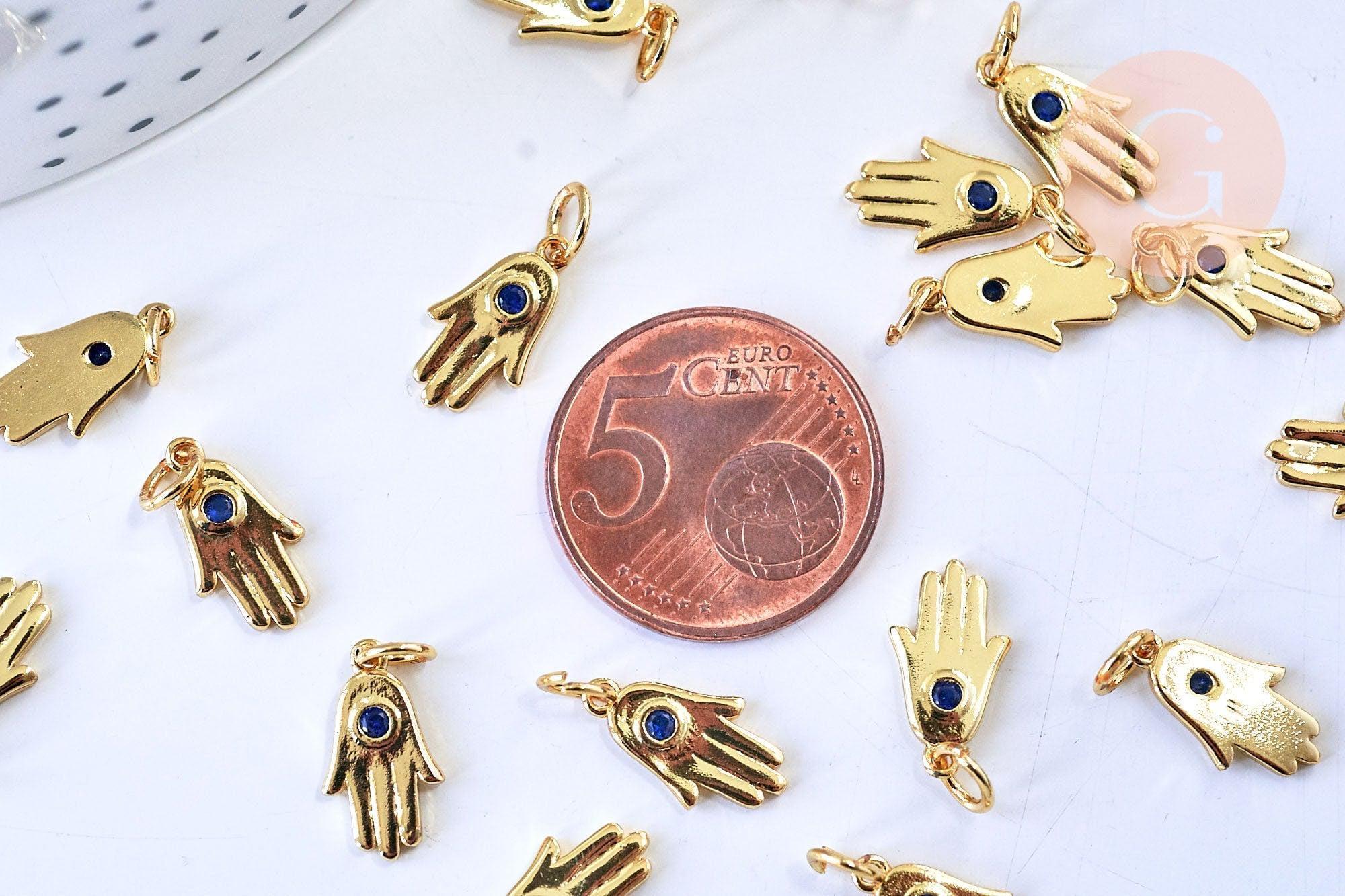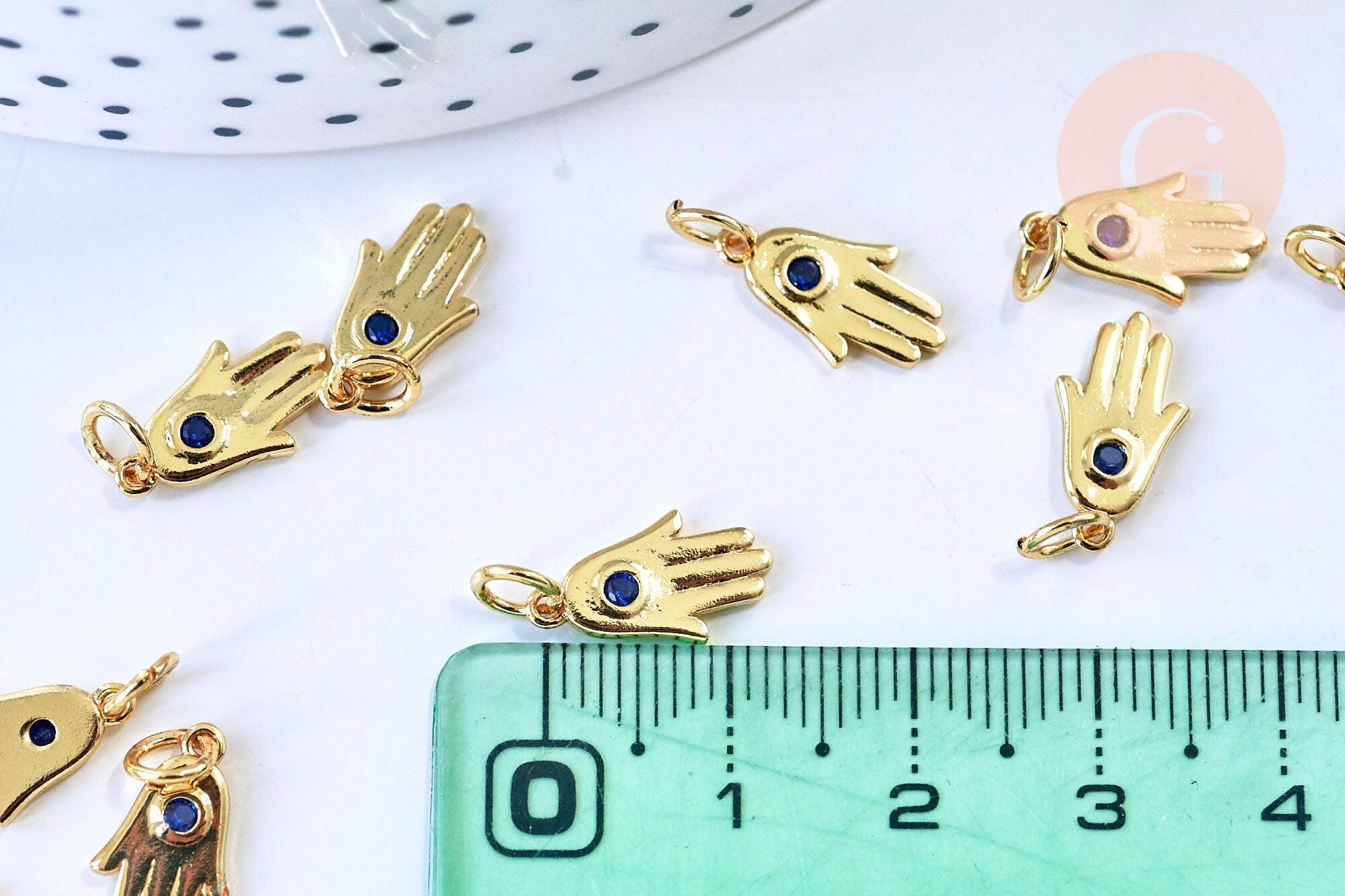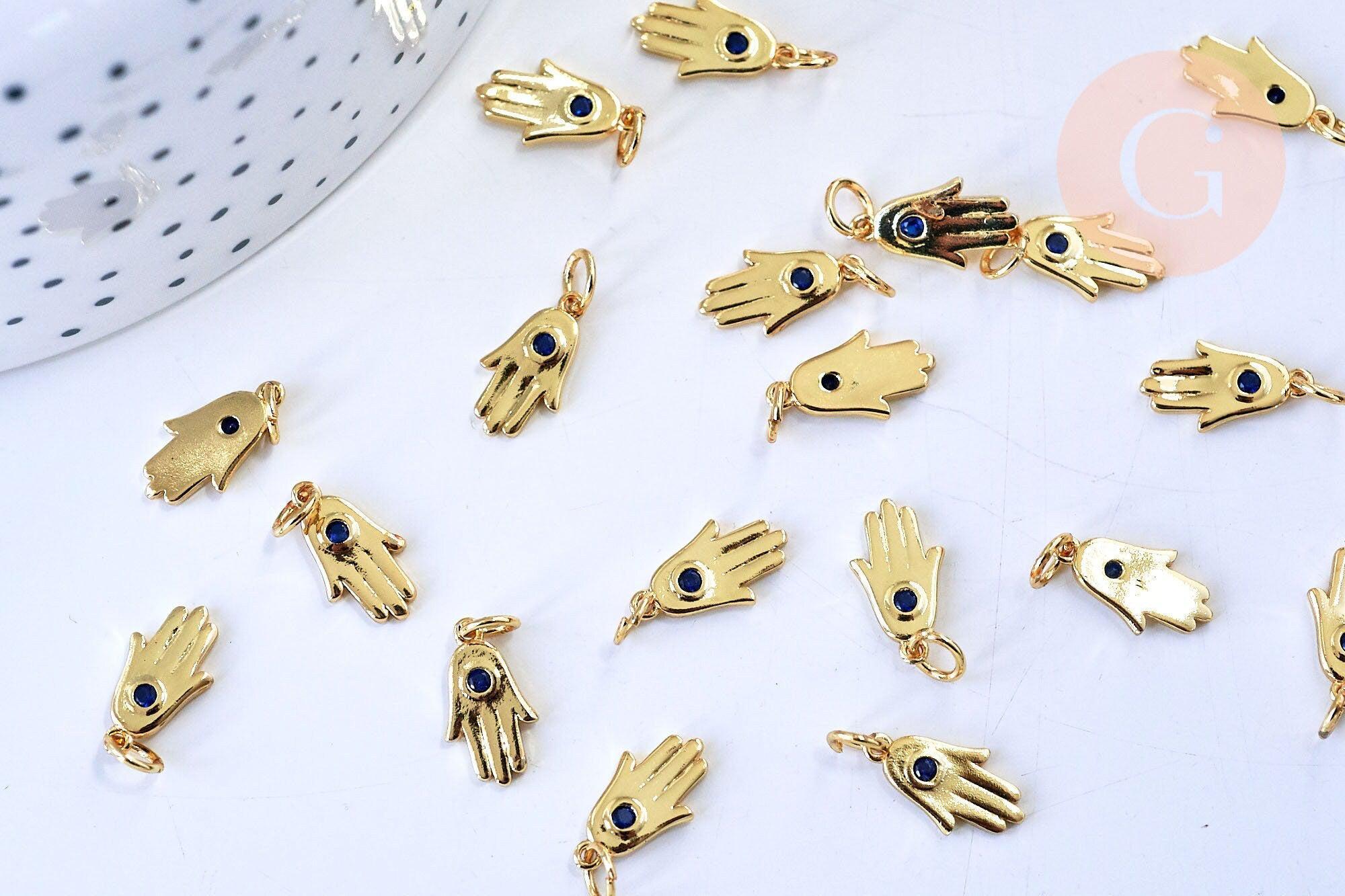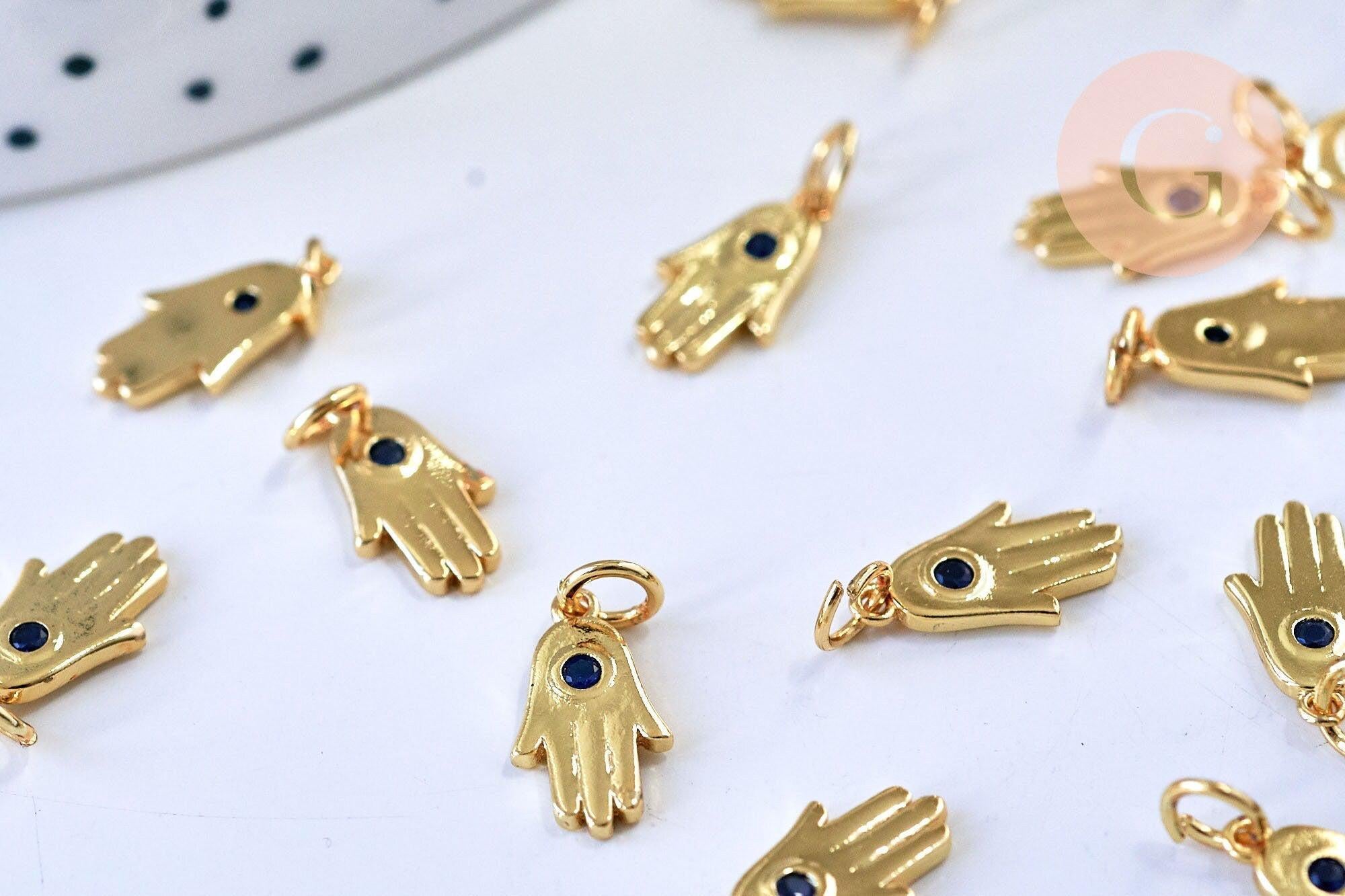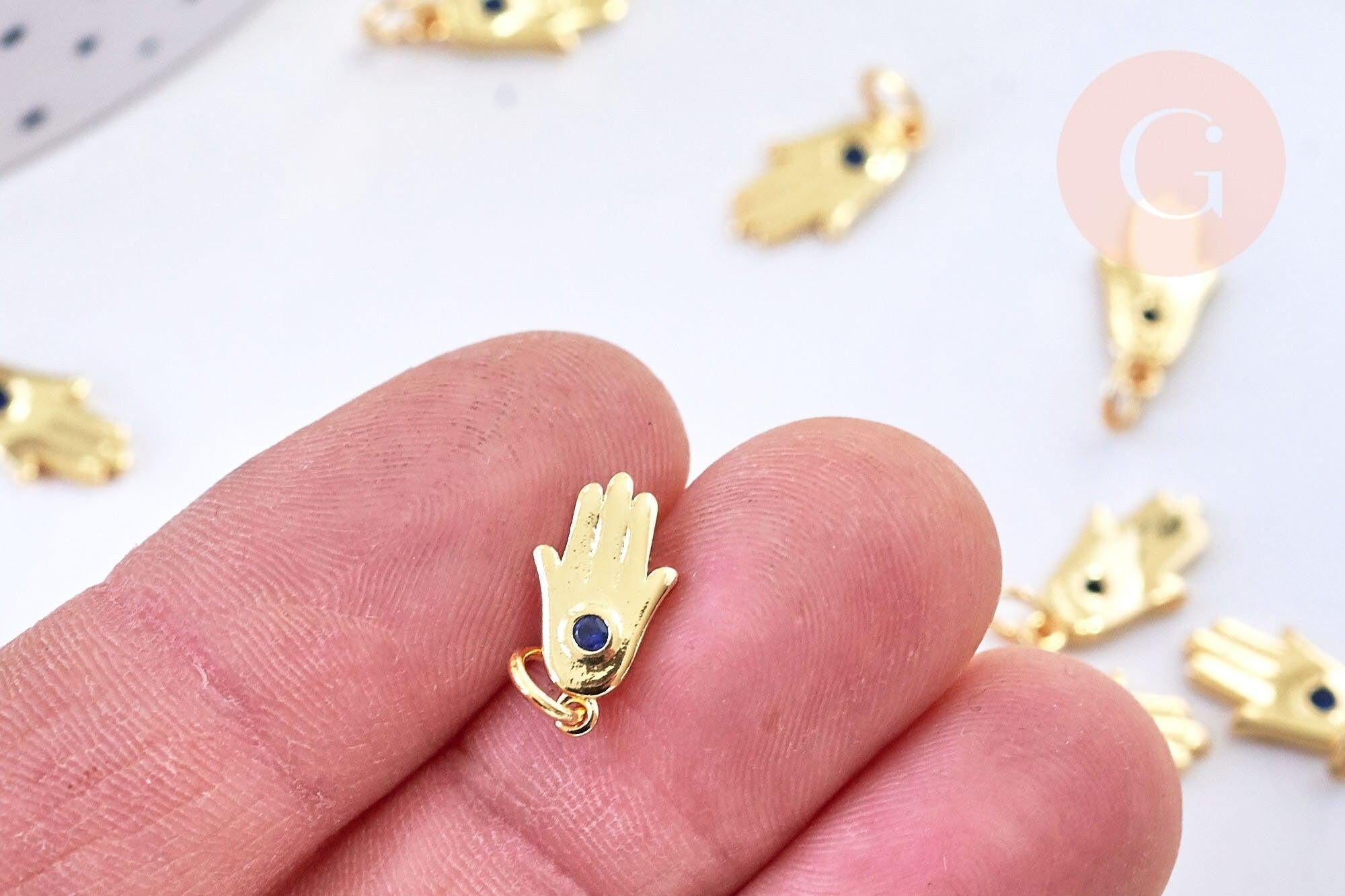 Para crear magníficos collares, pendientes y pulseras, adopte este colgante de mano de la suerte de latón bañado en oro de 18 quilates , decorado con un ojo con una circonita blanca.