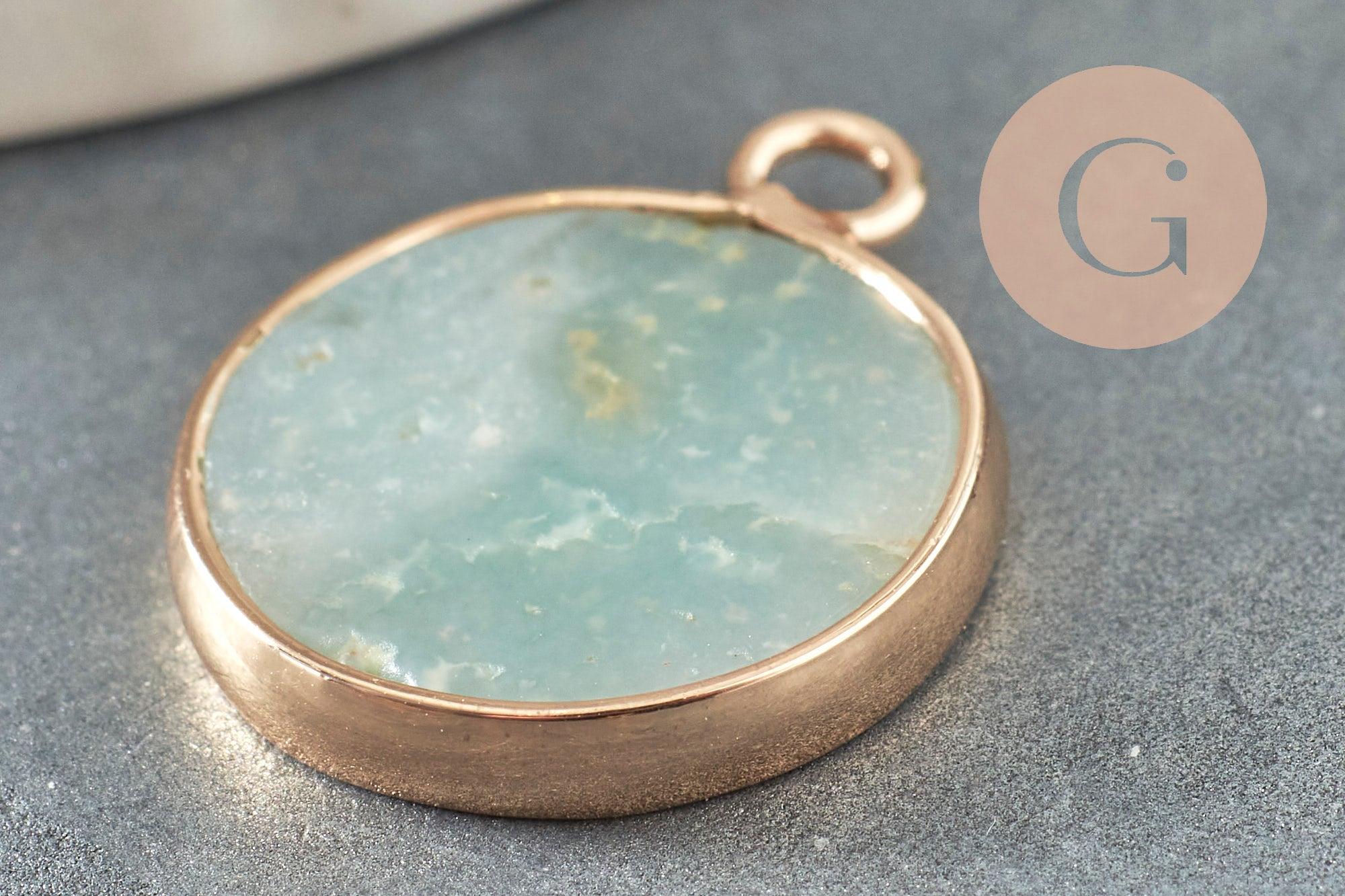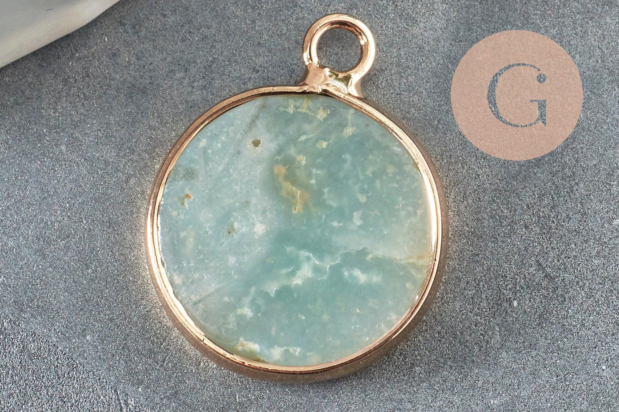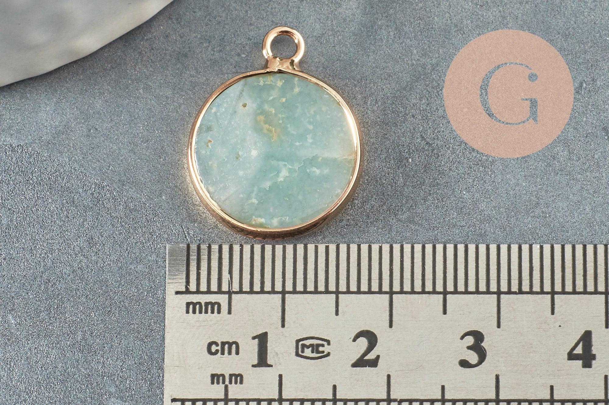 Este colgante redondo de amazonita natural aportará un toque suave y relajante a tus creaciones. Su piedra azul verdosa está rodeada por un borde de latón chapado en oro que realza a la perfección su iridiscencia natural. Un elemento elegante y atemporal para crear joyas refinadas, luminosas y únicas.