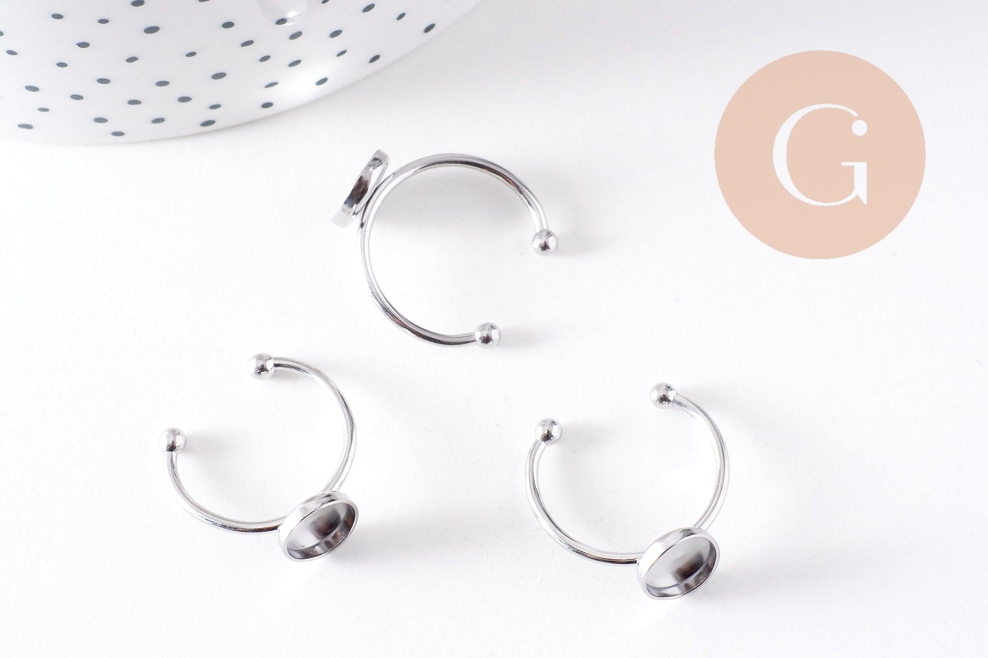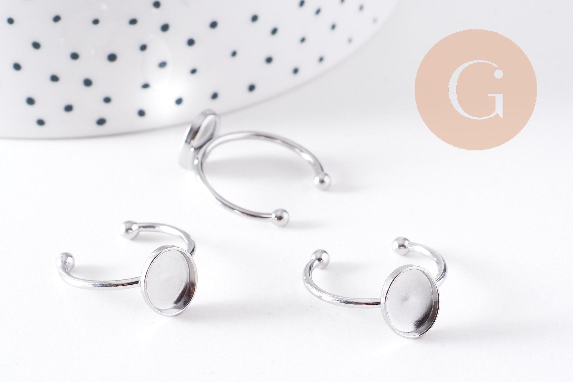 Crea joyas únicas con este anillo ajustable en acero inoxidable 304 con acabado platino , ideal para sujetar un cabujón ovalado de 9x10mm . Su diseño sencillo y moderno lo convierte en una base perfecta para crear anillos personalizados con cabujones de piedra natural, vidrio o resina .