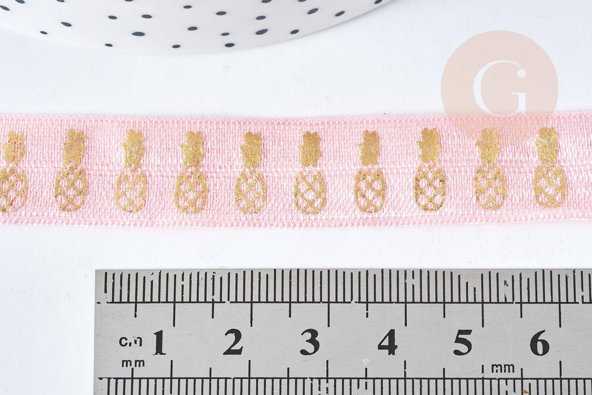 Te encantará esta cinta elástica ancha con su estampado de PIÑAS doradas sobre fondo rosa.