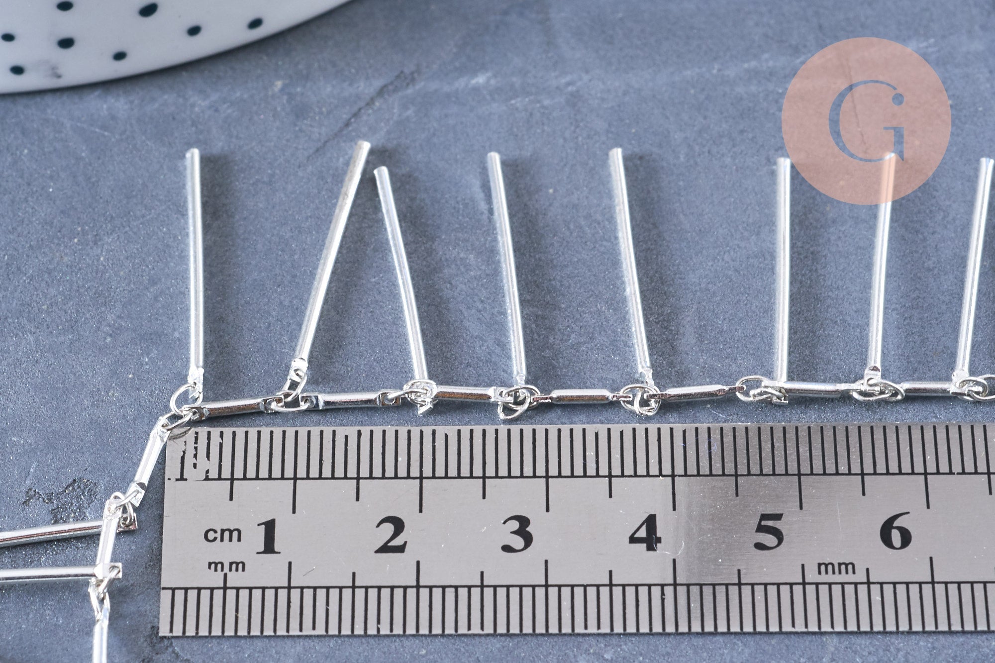 Cadena con flecos, de latón plateado, vendida por metros. Está formado por una cadena decorada con tubos cada 1cm.