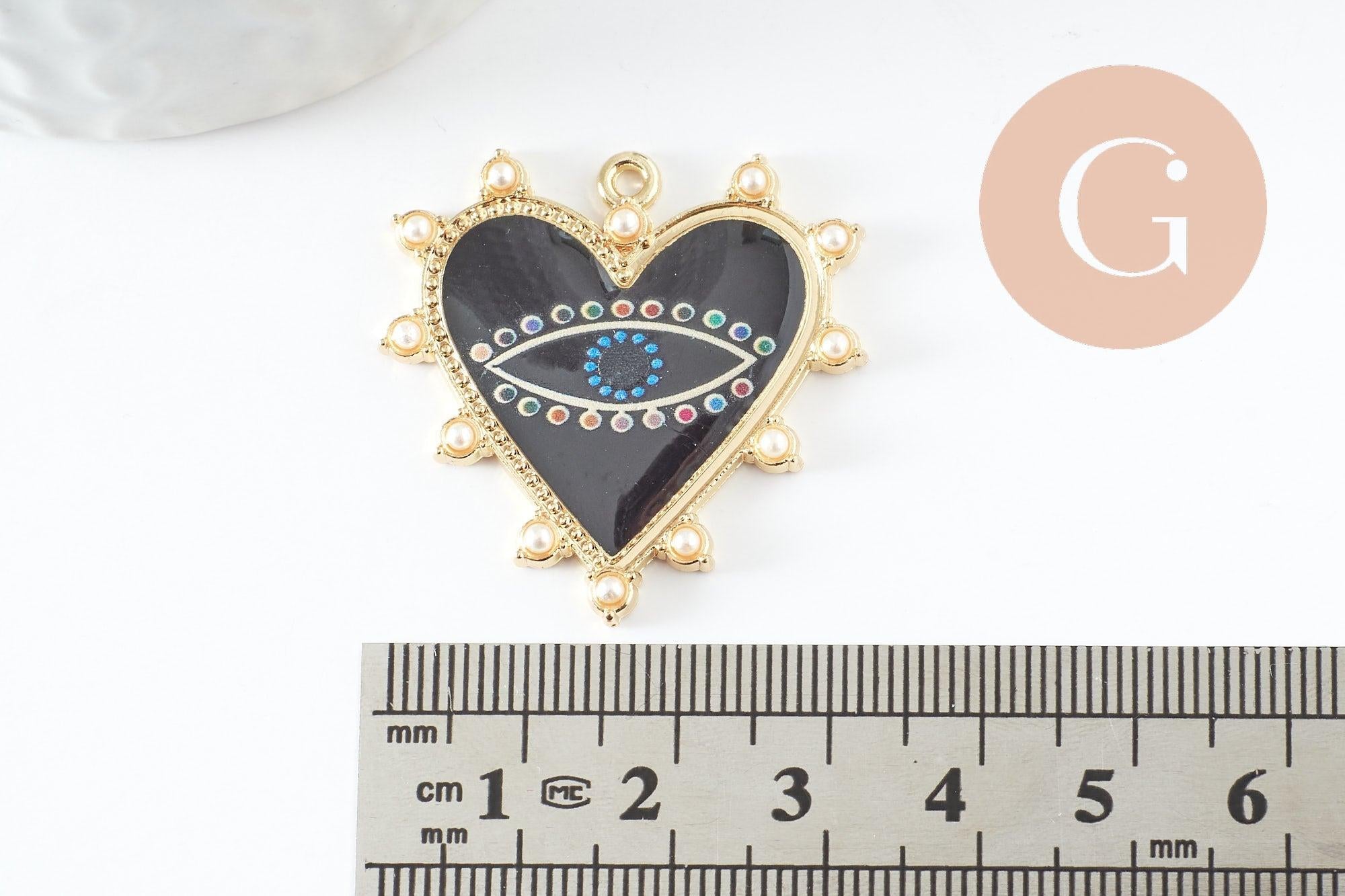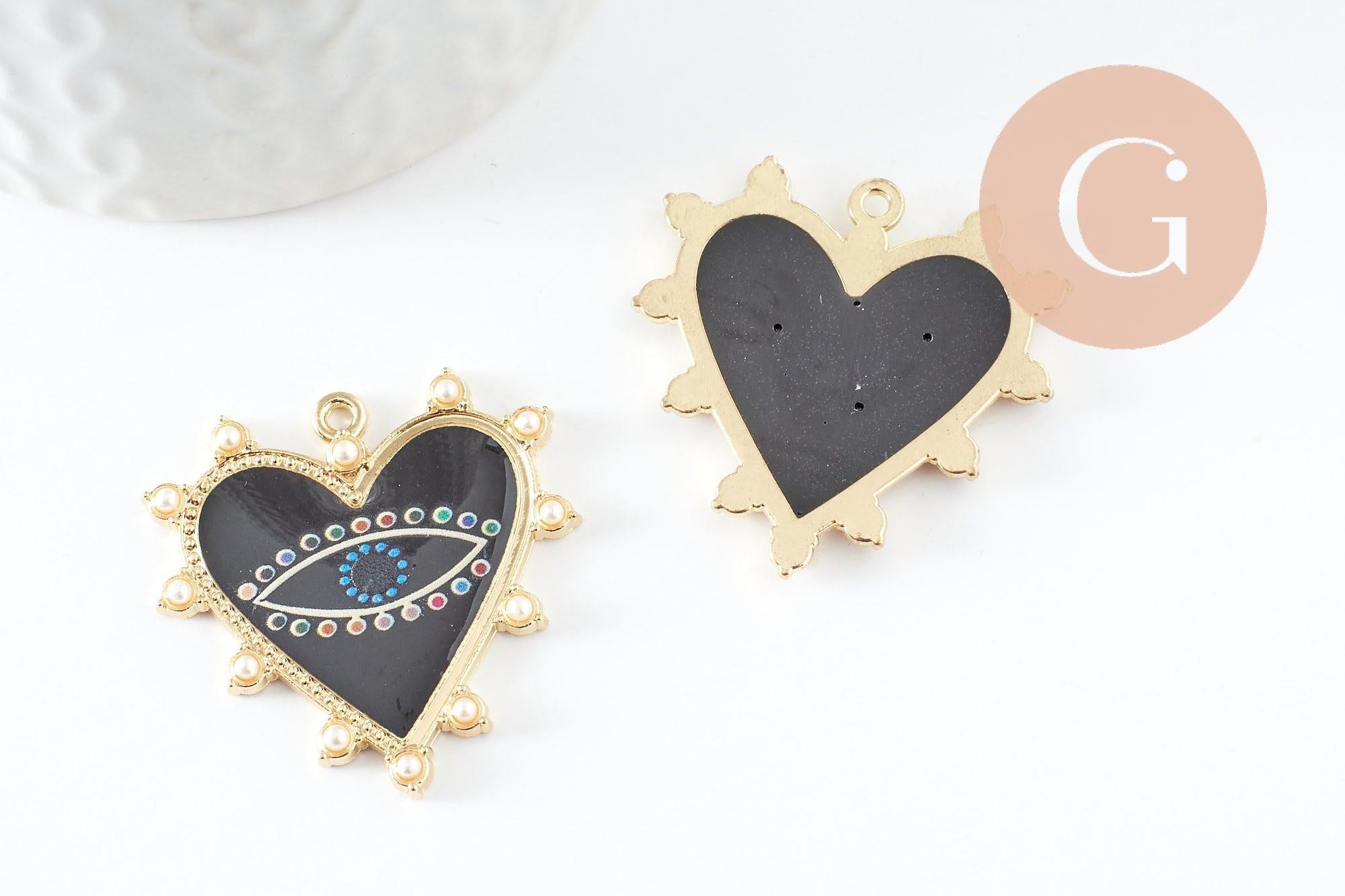 Adopta este colgante de corazón en zamac dorado y esmalte negro, decorado con un ojo protector, para crear tus pequeñas joyas de amor: ideal para crear pendientes y collares.