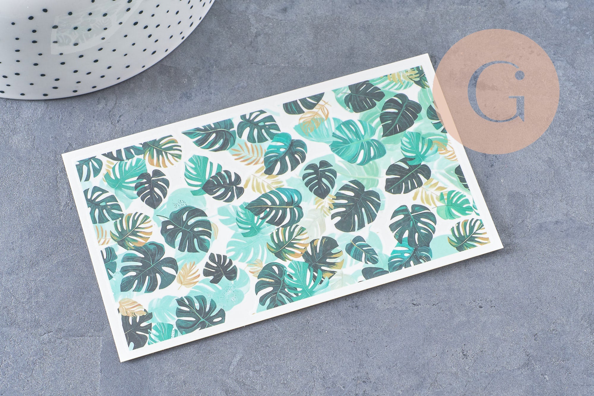 Crea joyas exóticas y coloridas con esta lámina de transferencia con estampado vegetal. Compatible con arcilla polimérica, le dará un toque natural y moderno a tus creaciones.