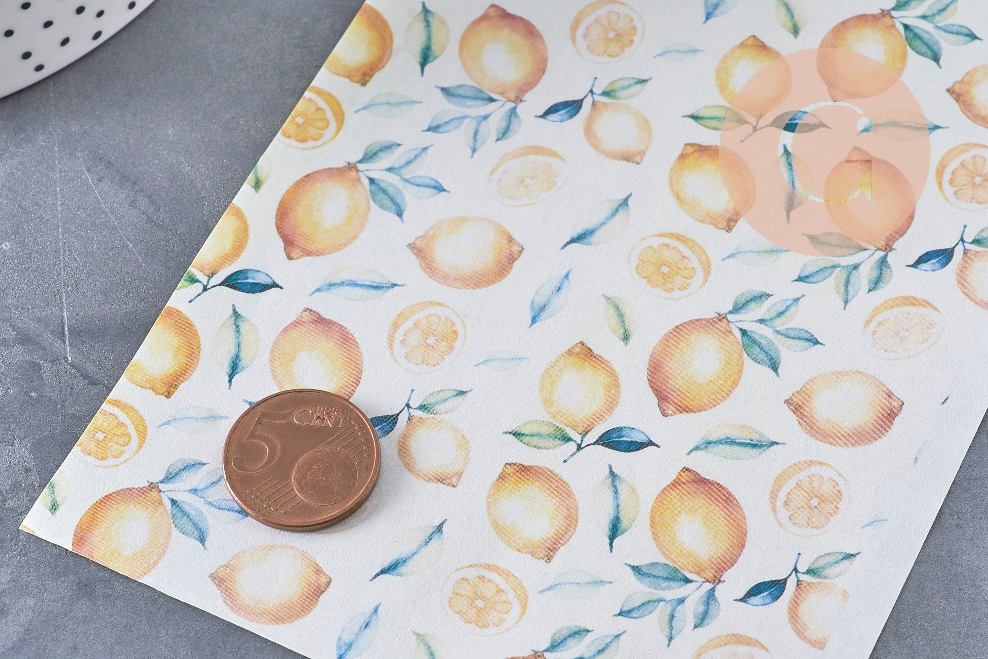 Hoja de transferencia de polímero con patrón de limón y acuarela, ideal para crear joyas DIY de verano brillantes y elegantes.