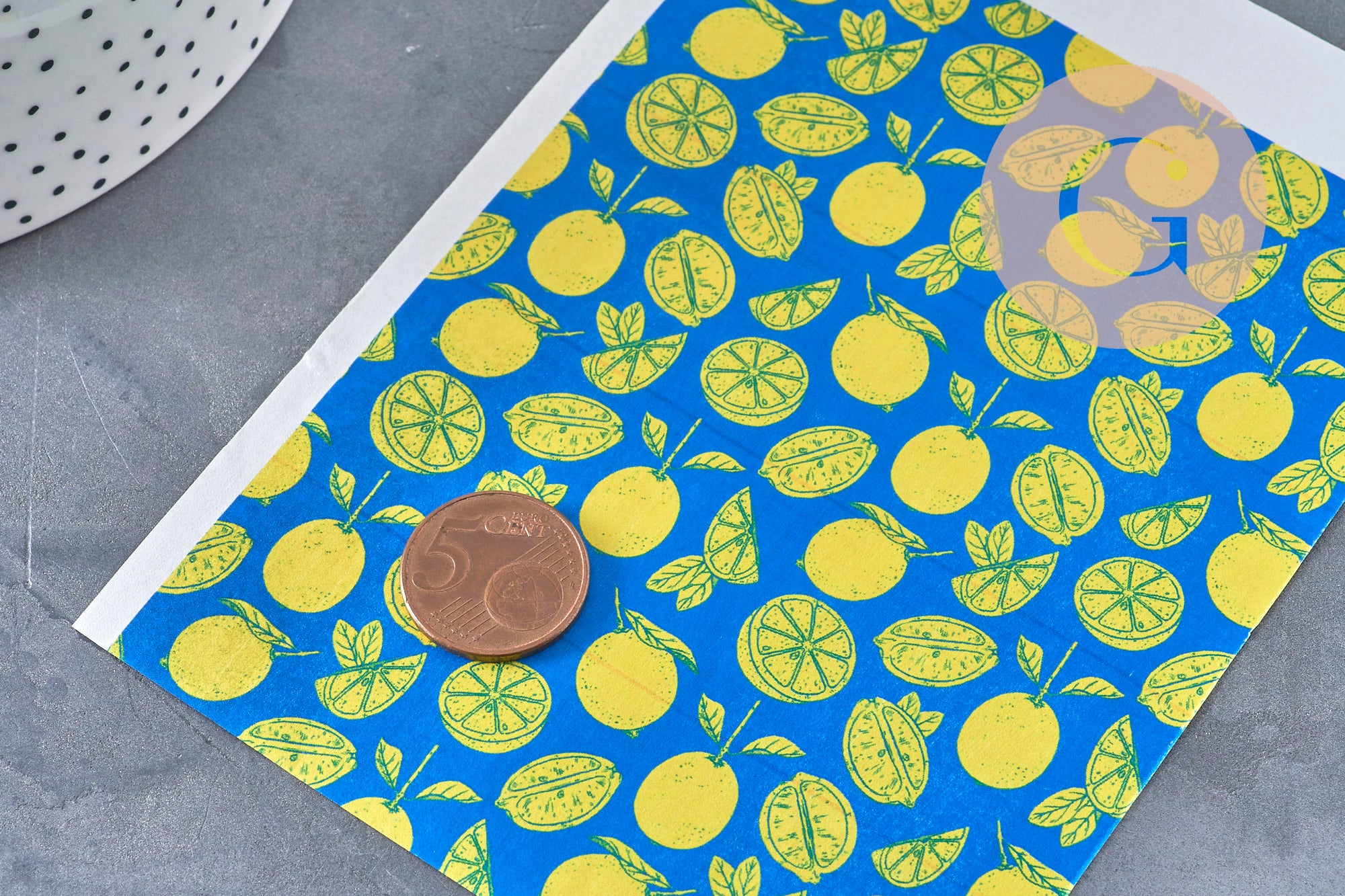 Lámina de transferencia de polímero – Patrón de limones sobre fondo azul, 14x10 cm, x1 (G11010) VÁLIDO
