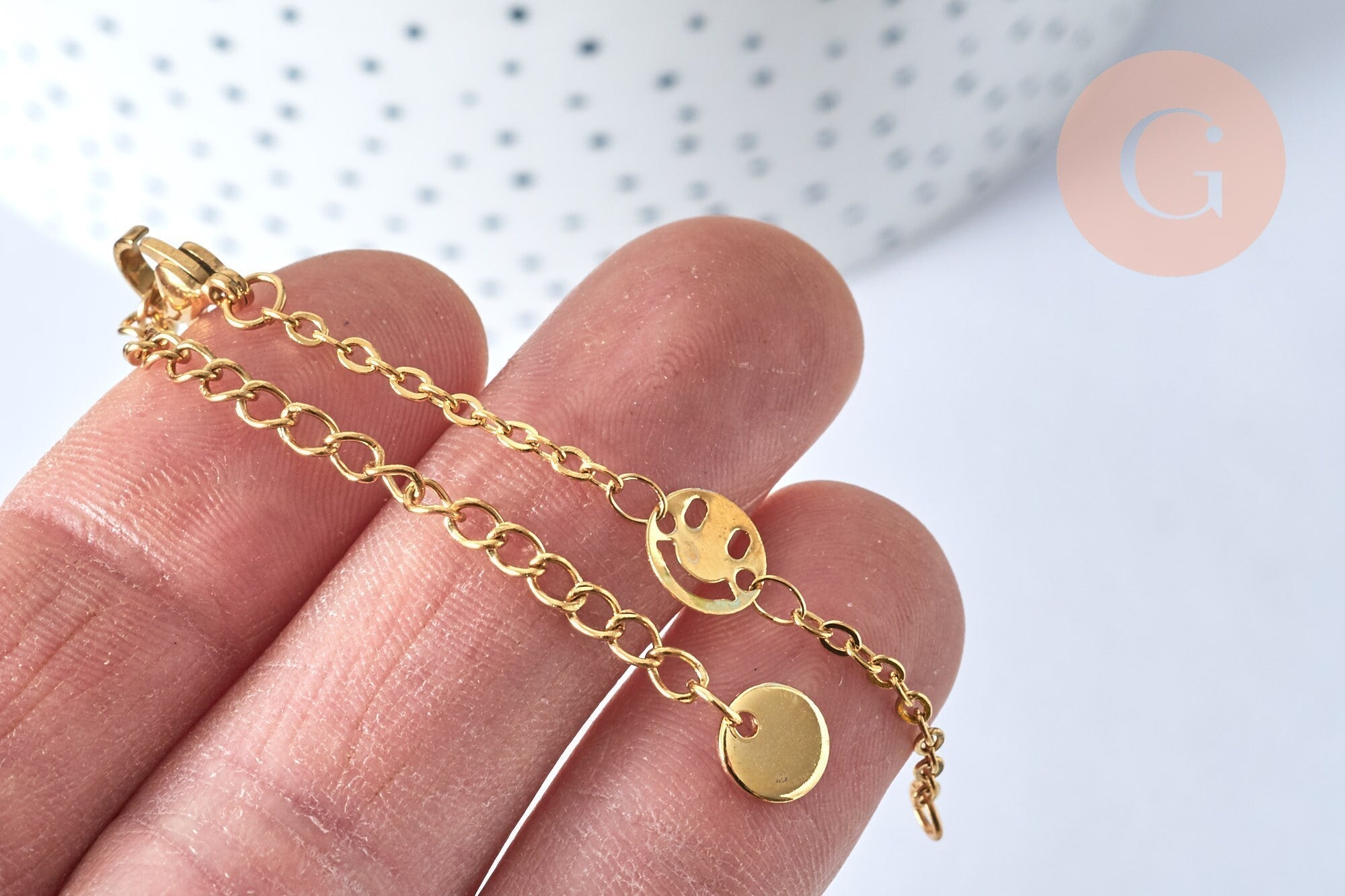 Esta base de pulsera de malla plana y dije sonriente en acero chapado en oro de 14k es ajustable gracias a su cadena de extensión y personalizable gracias a sus dos anillos al final de la cadena para personalizar mediante un colgante de conector.