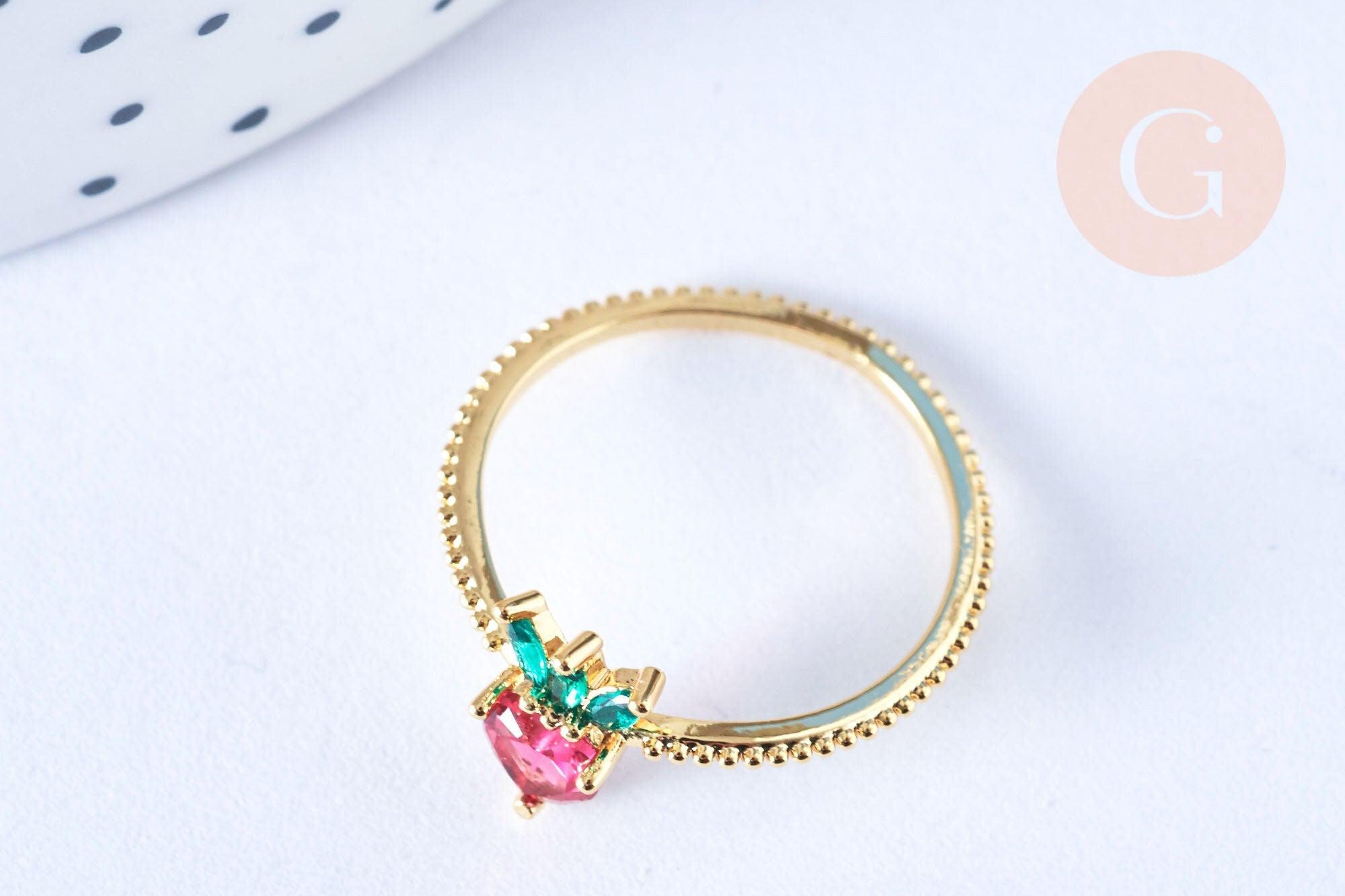 Déjate seducir por este adorable anillo en forma de fresa , con incrustaciones de circonitas rojas y verdes. Montado sobre una banda de latón bañada en oro de 16 quilates, este elegante anillo es un concentrado de dulzura y energía, perfecto para los días soleados o para un regalo original.