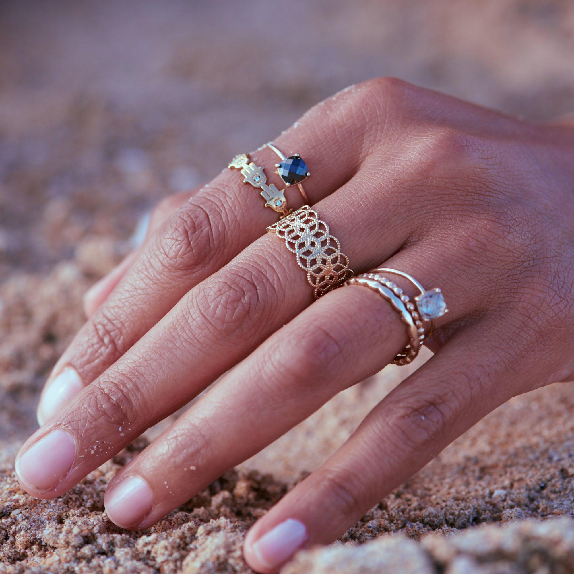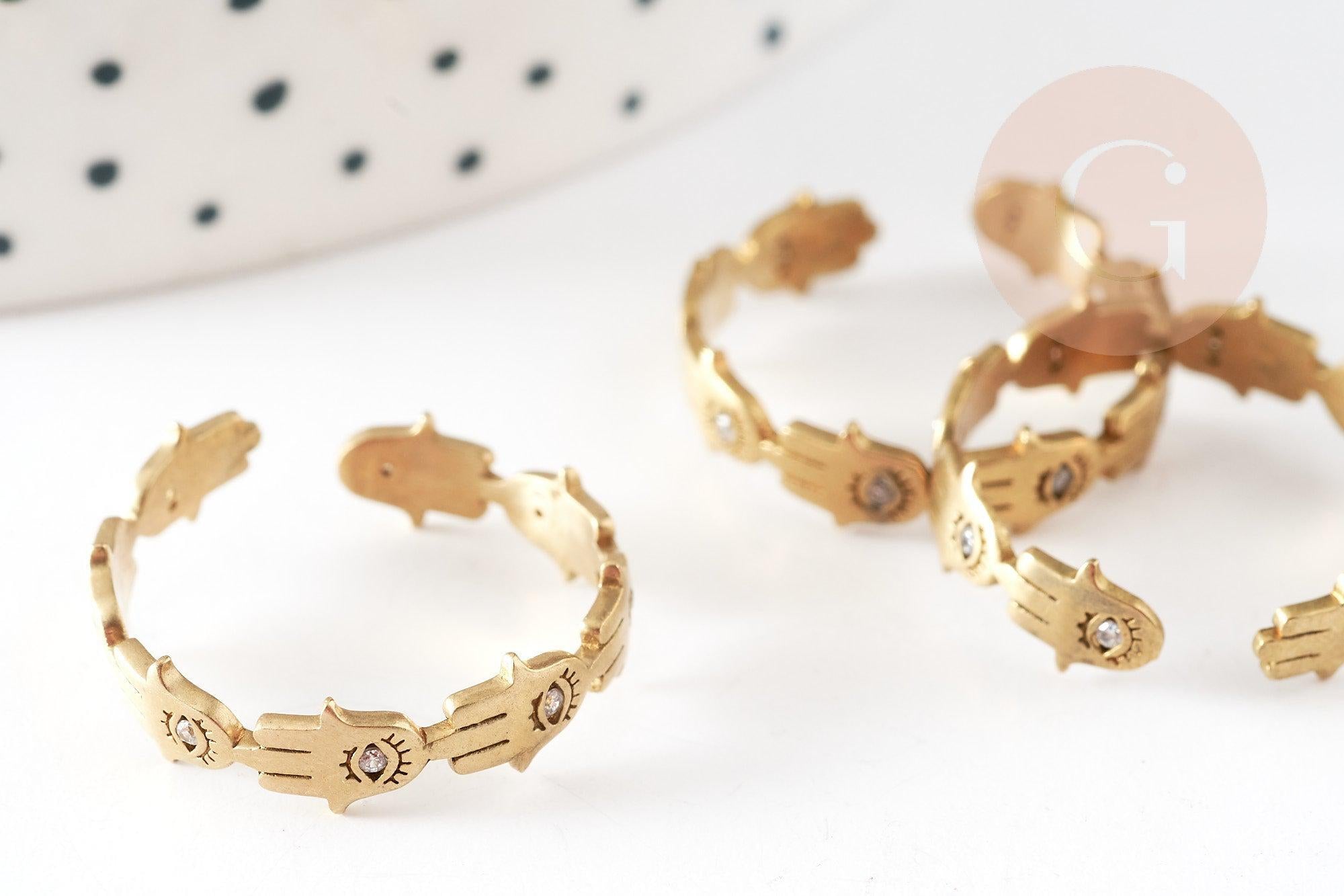 Un muy bonito porta anillos ajustable en latón en bruto compuesto por las manos de fatma con incrustaciones de un cristal en cada una de ellas.