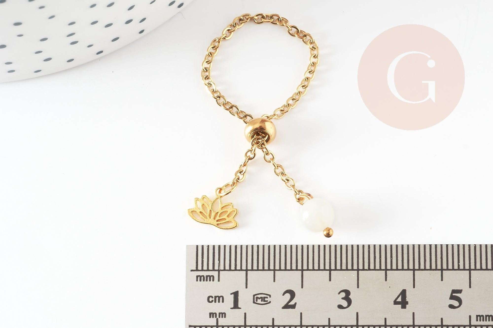 Bague réglable chaine acier lotus & perle 96mm, x1 (G5795)