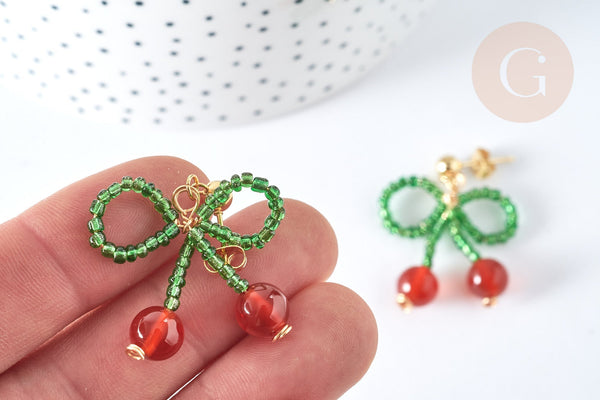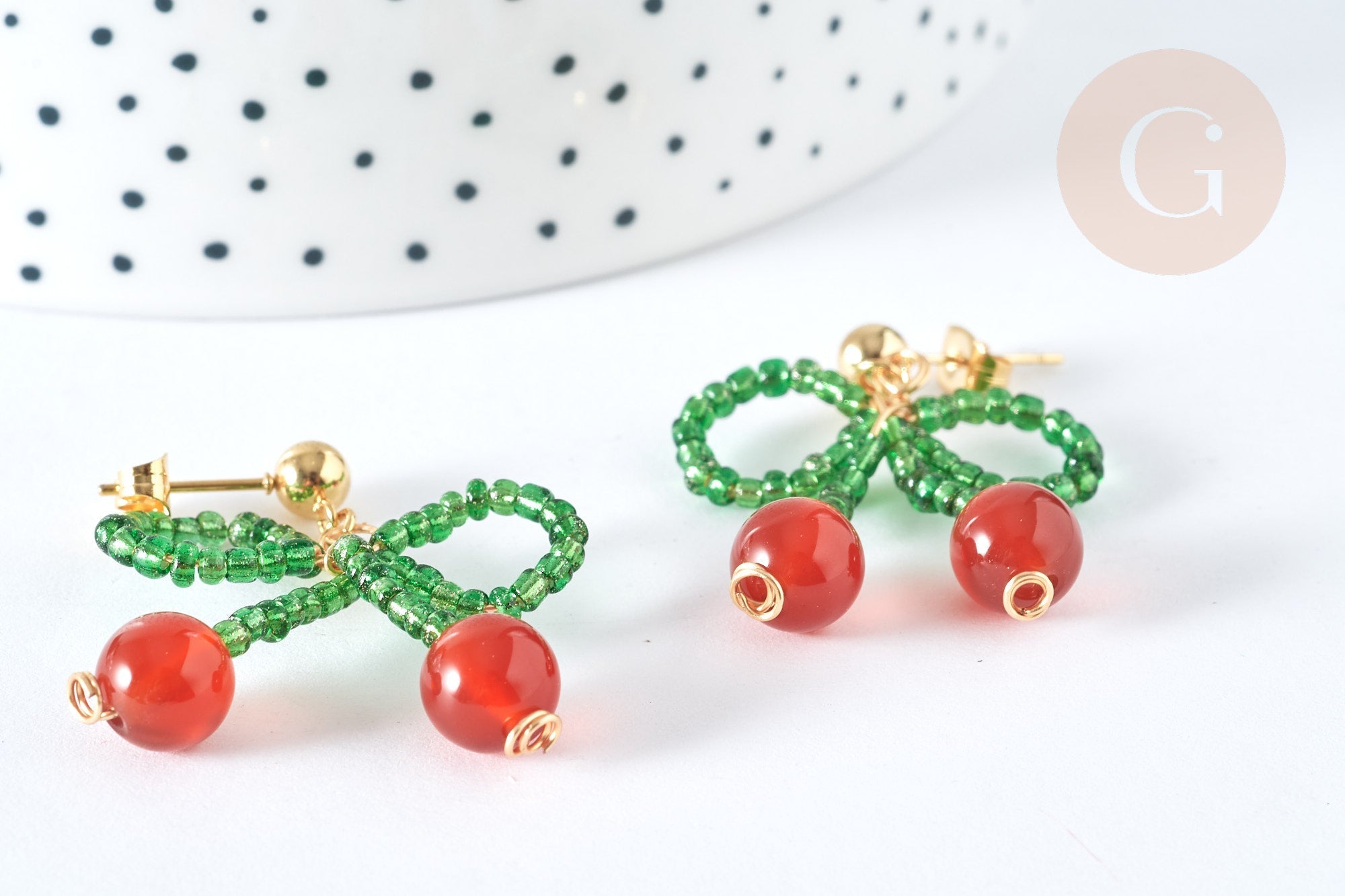 Añade un toque divertido y original con este par de pendientes con dije de cereza . Estos están hechos de cuentas de vidrio verde y ágata natural roja .