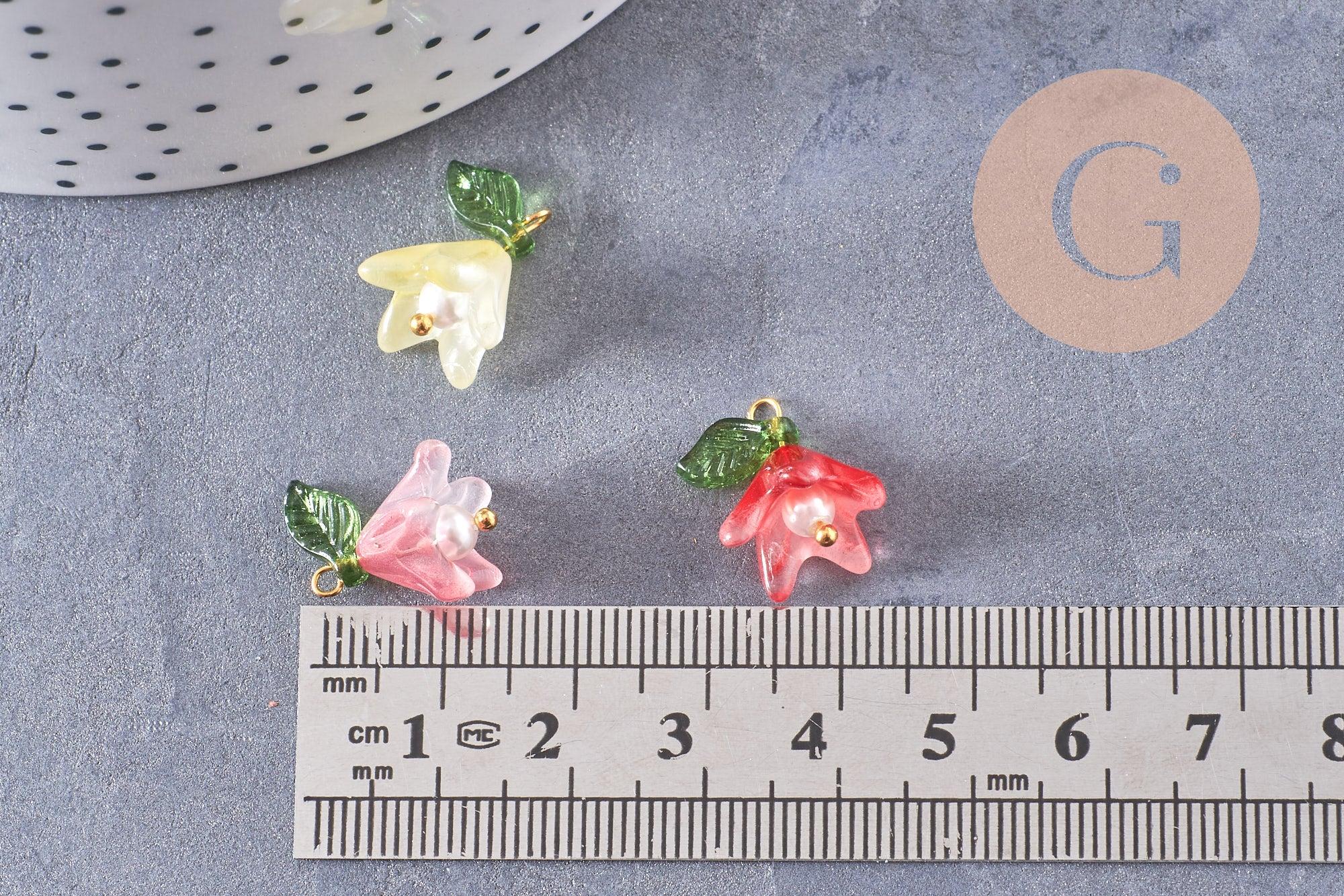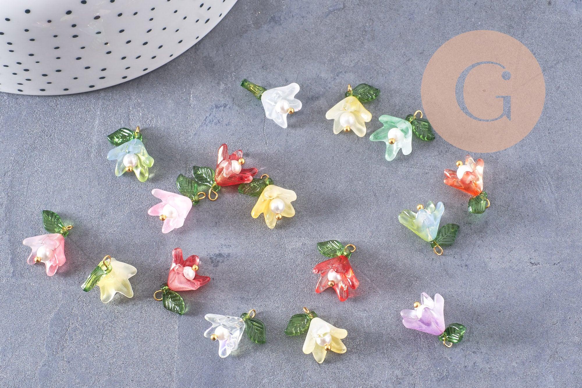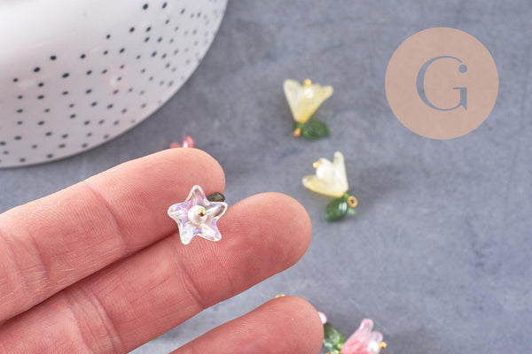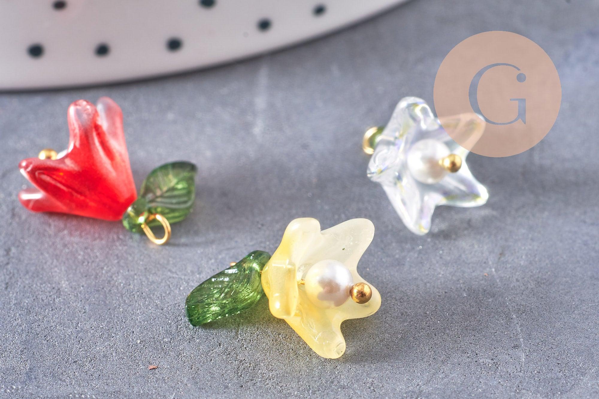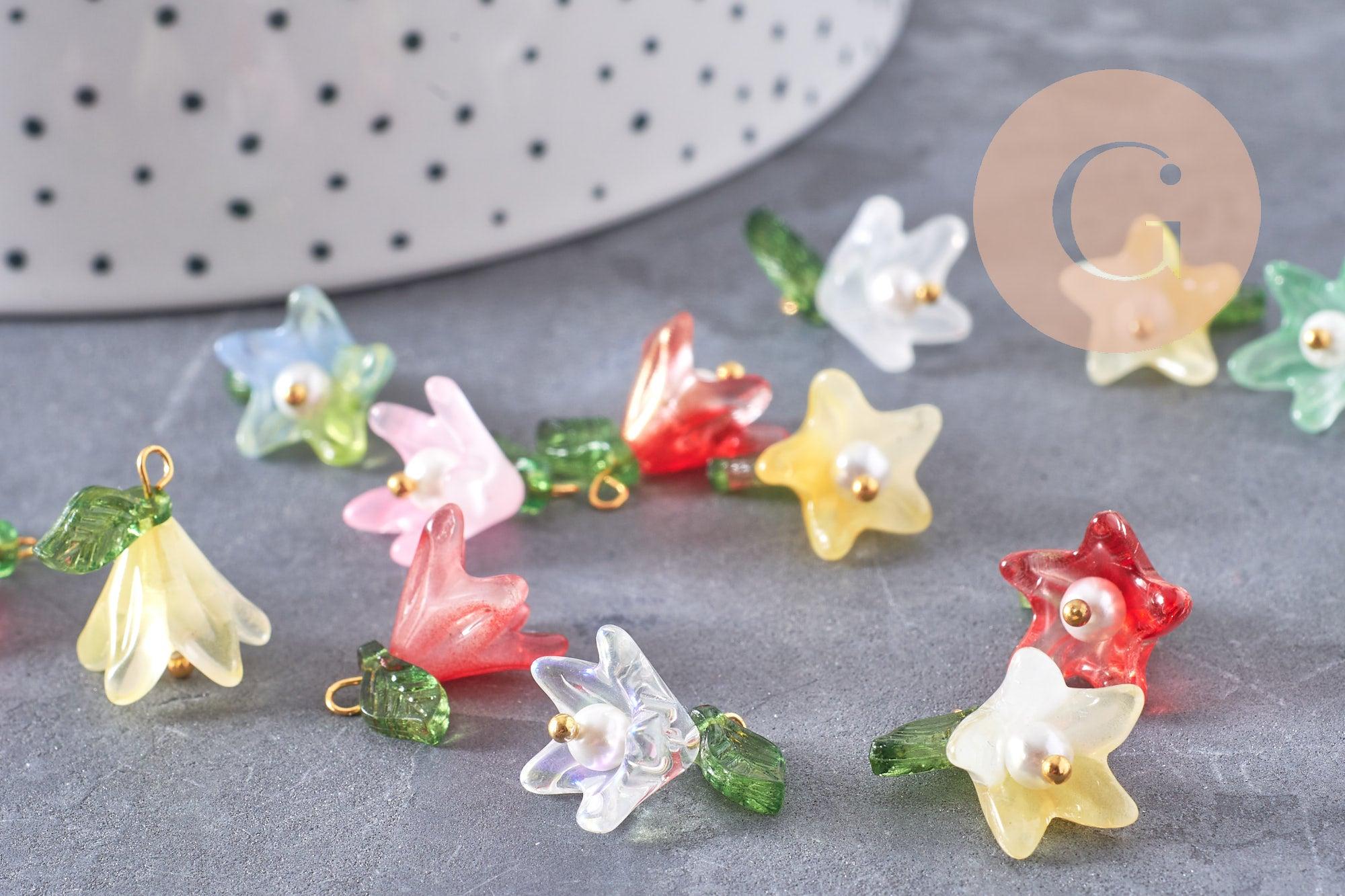 Añade un toque floral y refinado a tus creaciones con estos colgantes en forma de flor , elaborados en vidrio coloreado con un acabado nacarado sobre un tallo de latón chapado en oro .