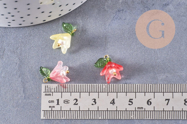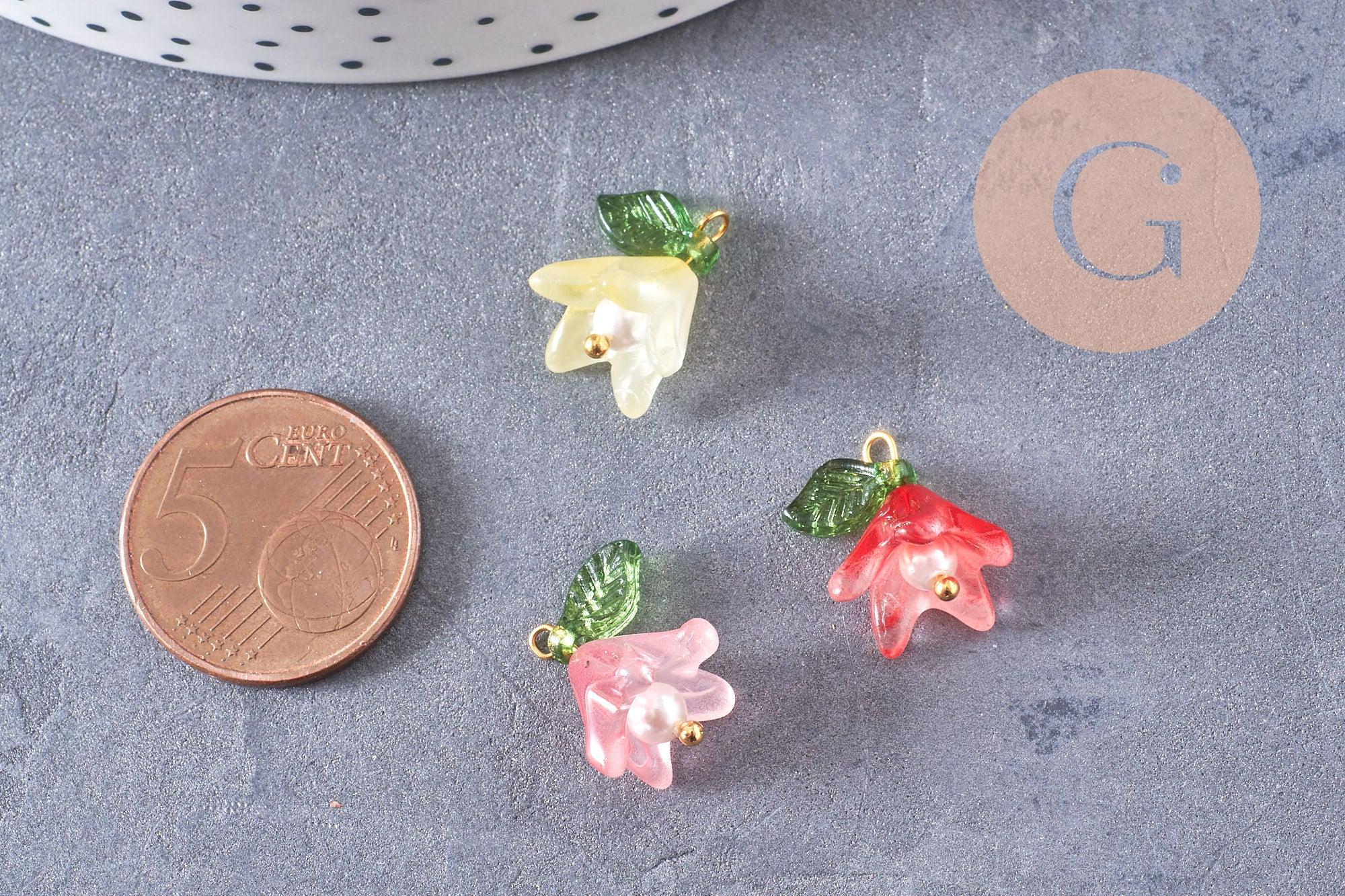 Dije de flor de vidrio coloreado, latón dorado, imitación perla, 15 mm, x5 (G10326)