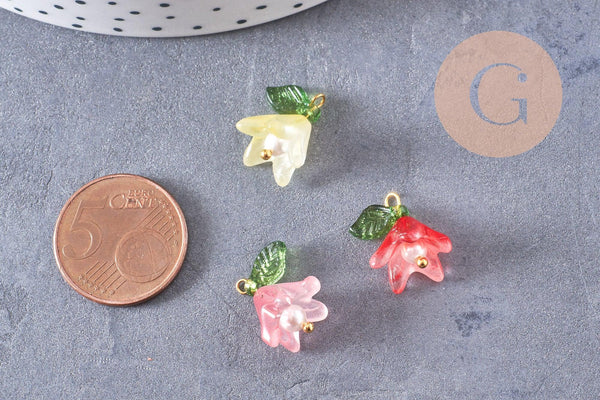 Breloque fleur verre coloré laiton doré imitation perle 15mm, x5 (G10326)