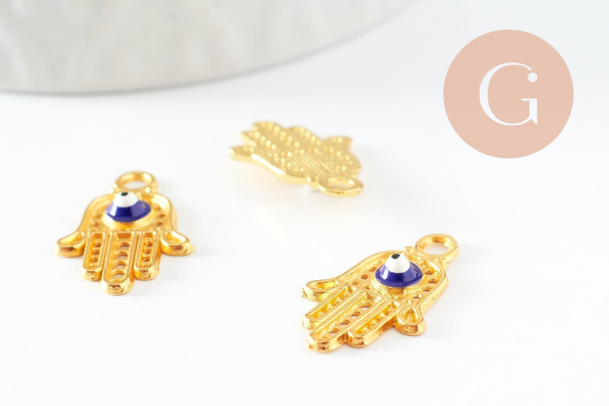 Para realizar magníficos collares, pendientes y pulseras, adopte esta mano de fatma, un pequeño colgante religioso y amuleto de la suerte de latón dorado, decorado con un ojo protector de esmalte azul.