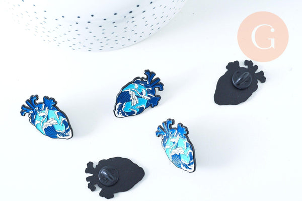 Te ofrecemos esto bonito pin, en zamac dorado, representando Un corazón decorado con olas y océano en esmalte azul vibrante.