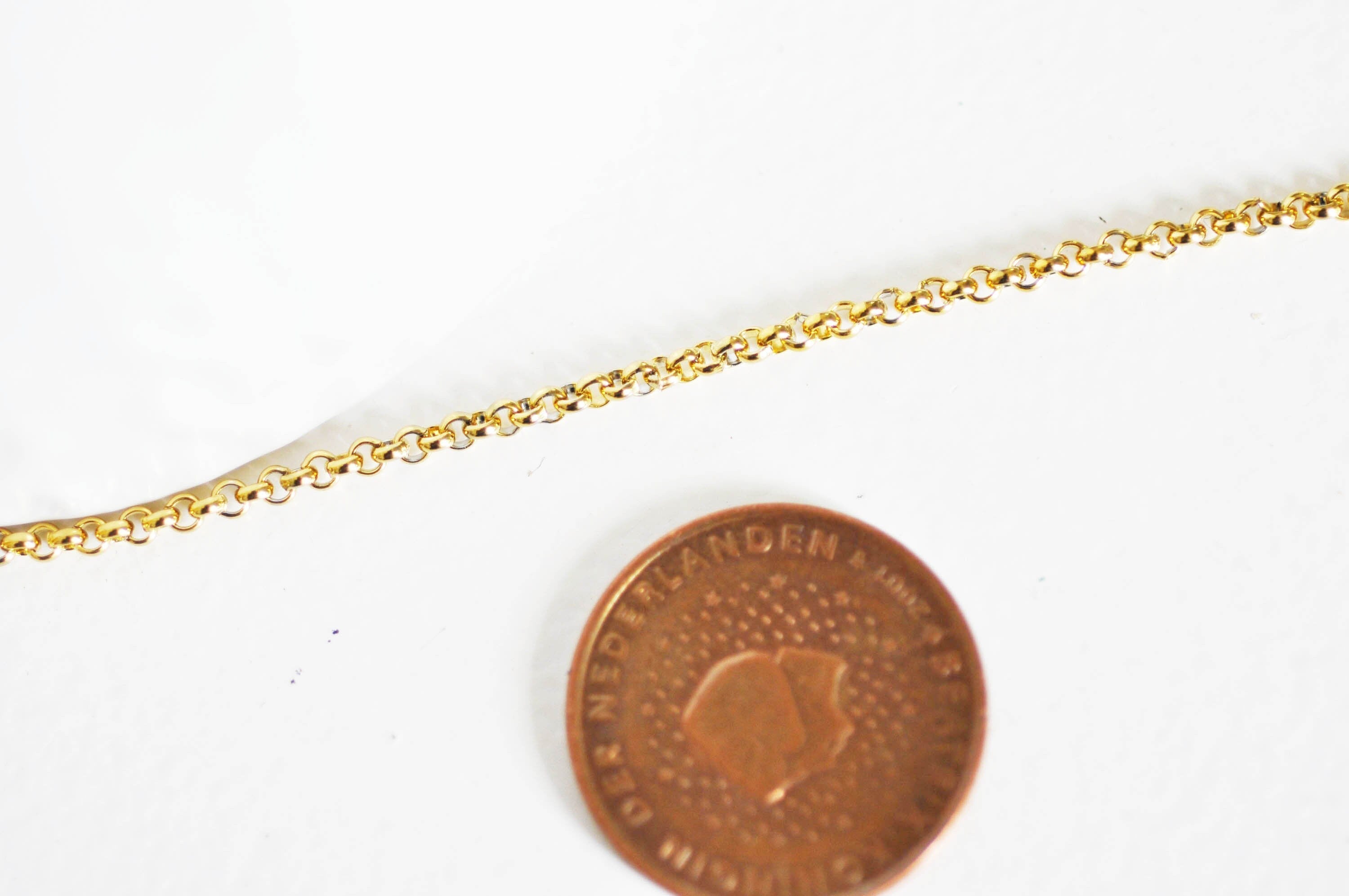 Añade un toque de elegancia atemporal a tus creaciones con esta cadena de eslabones rollo en acero inoxidable 304, chapada en oro de 18 quilates mediante Ion Plating (IP) .