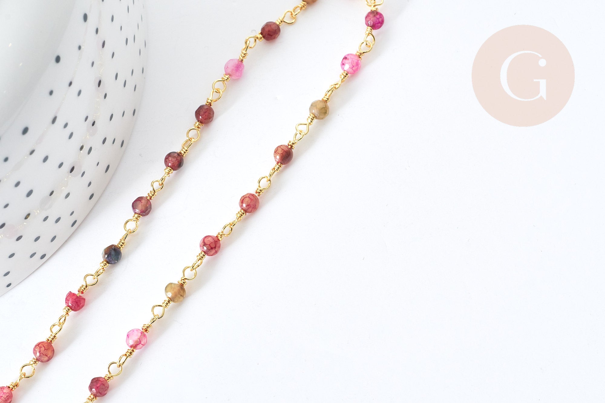 Déjate seducir por esta elegante cadena de latón bañada en oro , elaborada con ágatas naturales de varios colores, translúcidas y facetadas. Ideal para realizar numerosos accesorios de bisutería y moda.