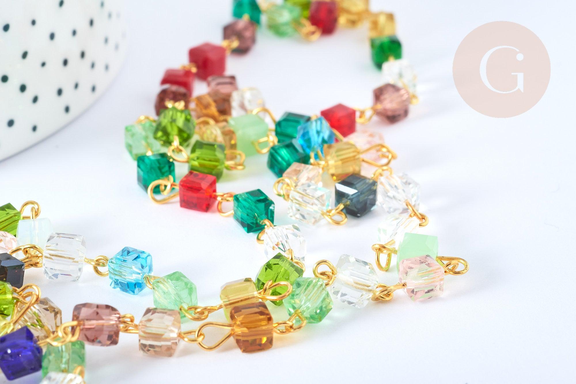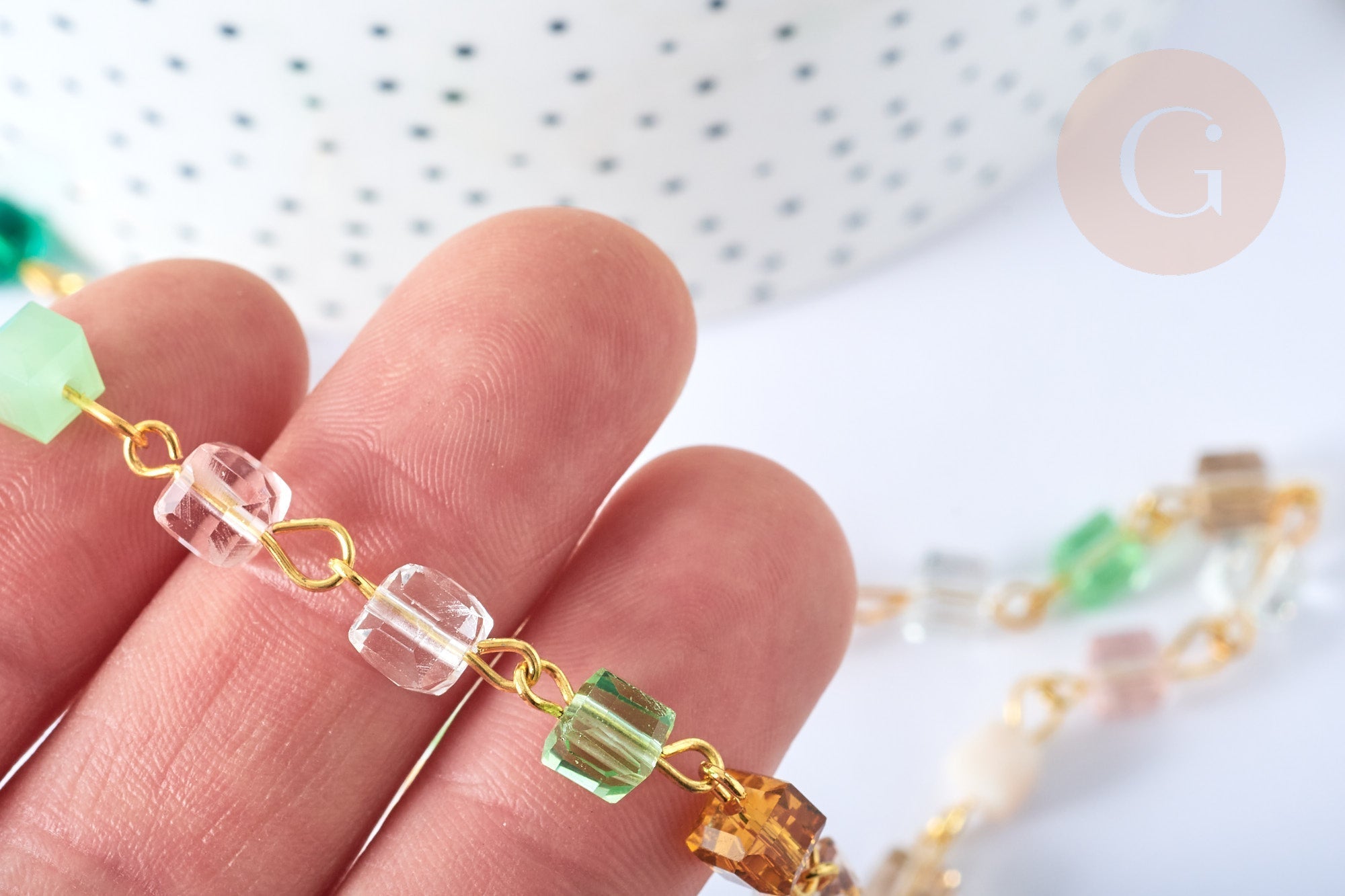 Adopta y crea muchas bonitas piezas de bisutería con esta cadena de bisutería con acabado en hierro dorado. Éste está hecho de cuentas de cristal de colores. ¿Qué hacer con estas cadenas de colores? 1. Córtalos a tu medida para...