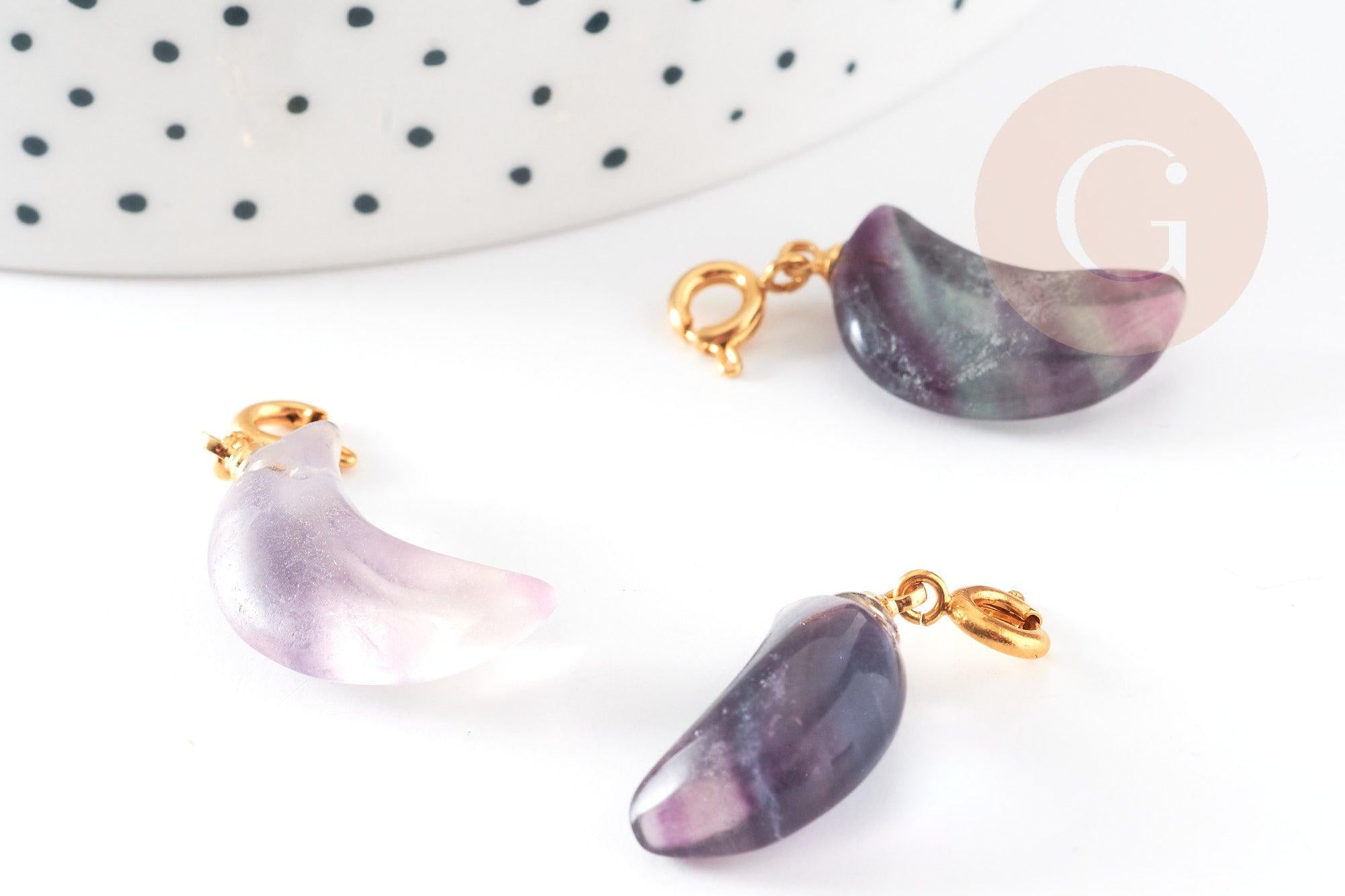 Charm Moon fluorita violeta latón dorado 25-28mm, colgante de piedra natural, fluorita natural, x1 (G3544)
