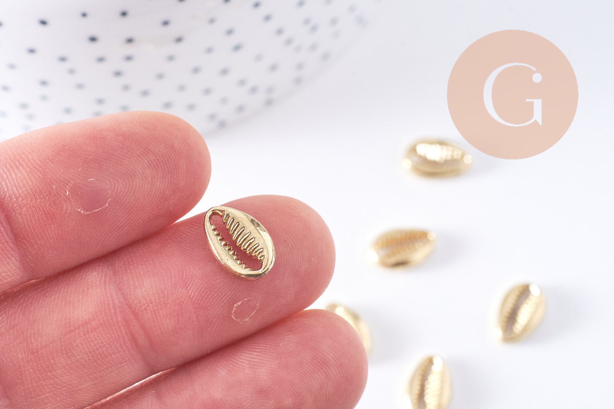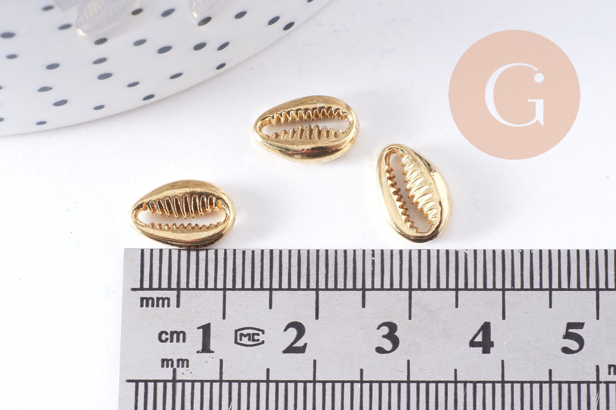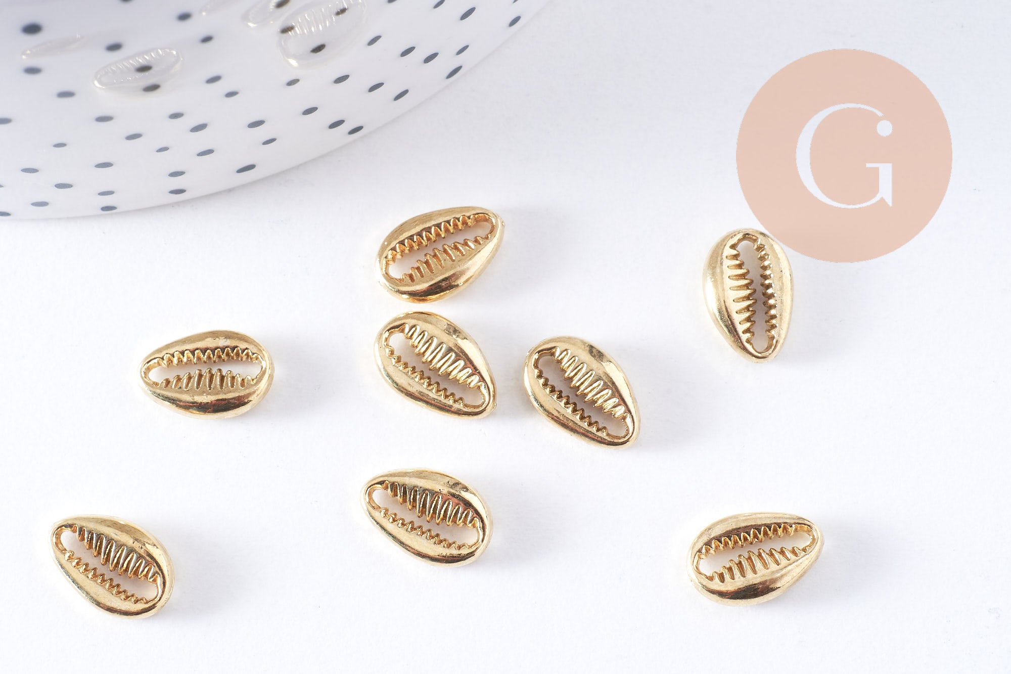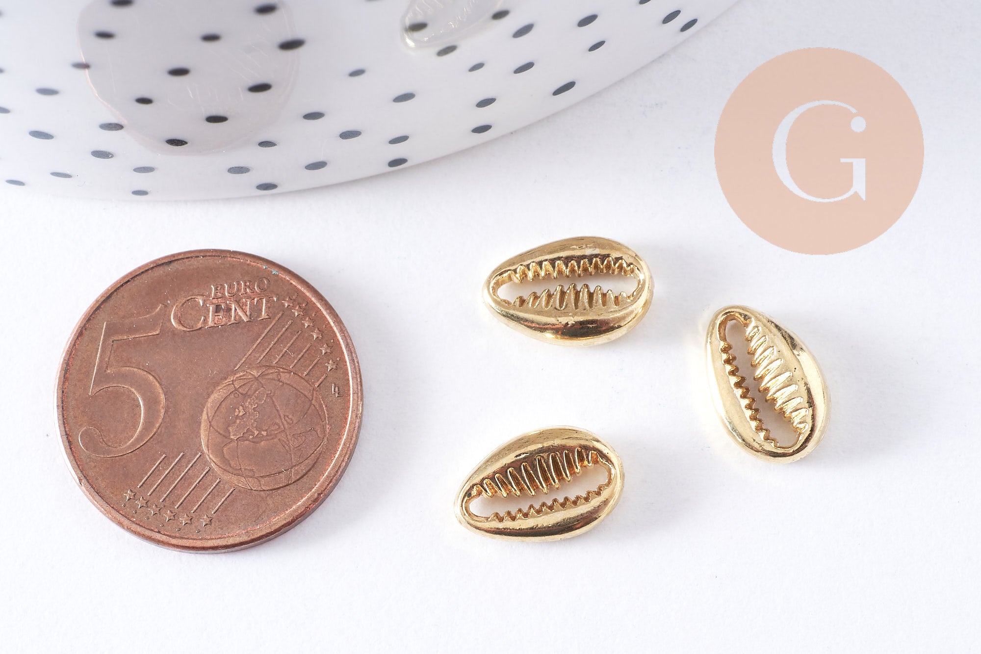 Otras conchas de cauri de metal dorado están disponibles en la tienda de fornituras y dijes. jengibrelilyfrancia