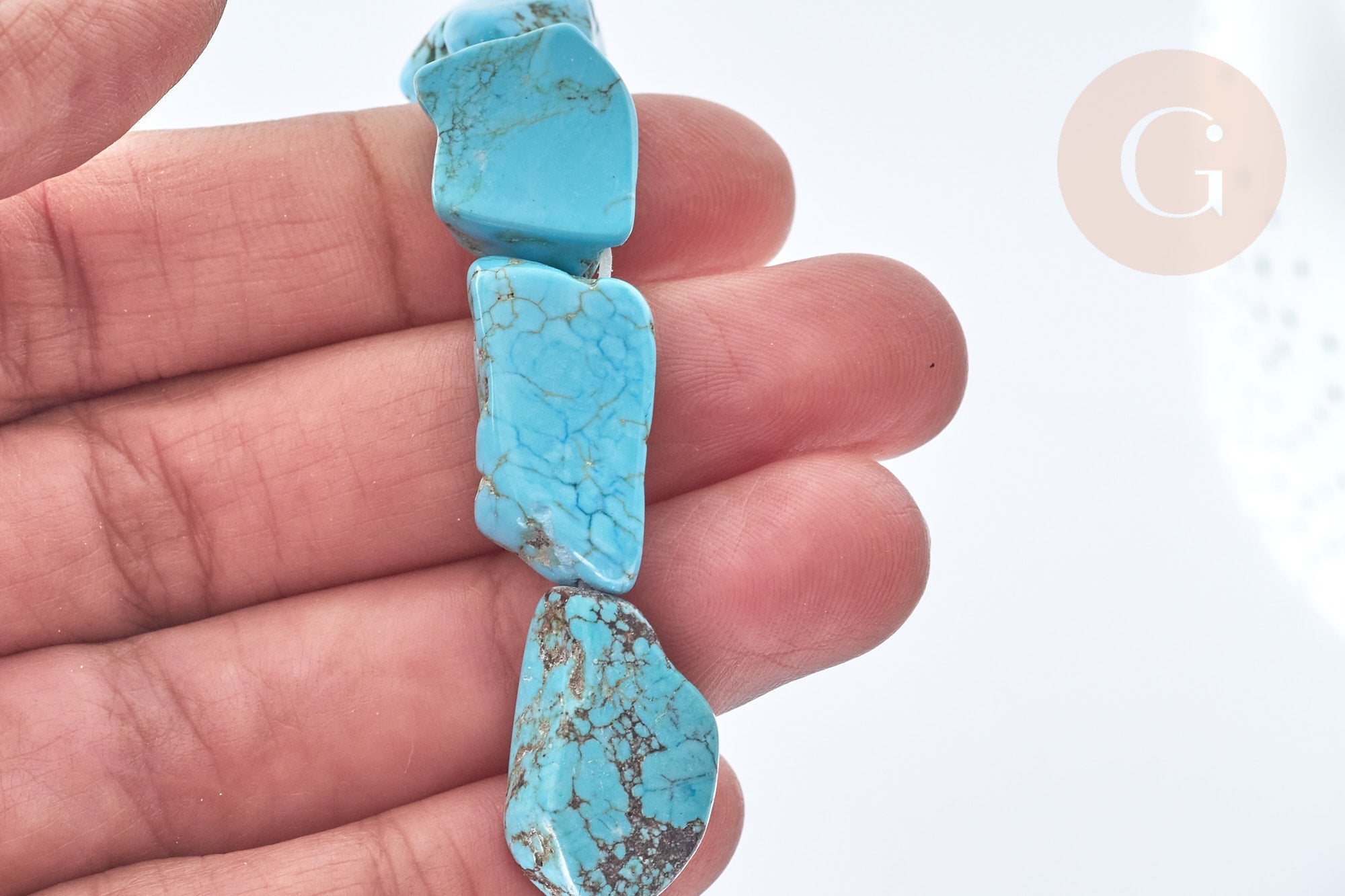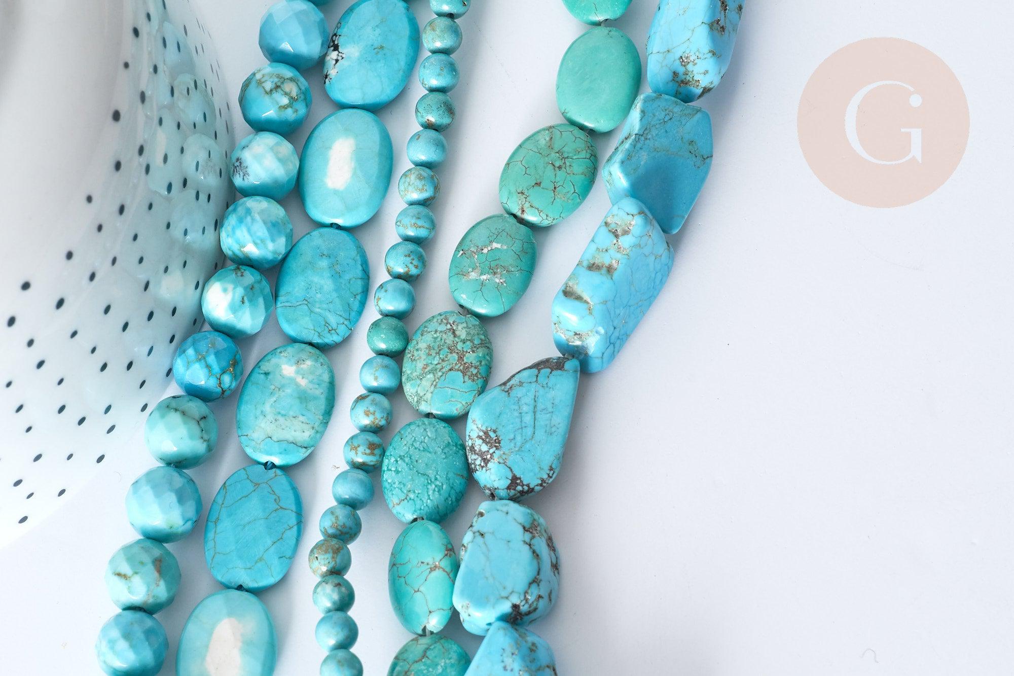 Dale un toque étnico y colorido a tus creaciones DIY con esta magnífica tira de cuentas de howlita natural con un tono turquesa oscuro . Disponibles en una variedad de formas (pepitas, redondas, facetadas), estas cuentas de piedras semipreciosas te permitirán crear joyas únicas y llenas de carácter.