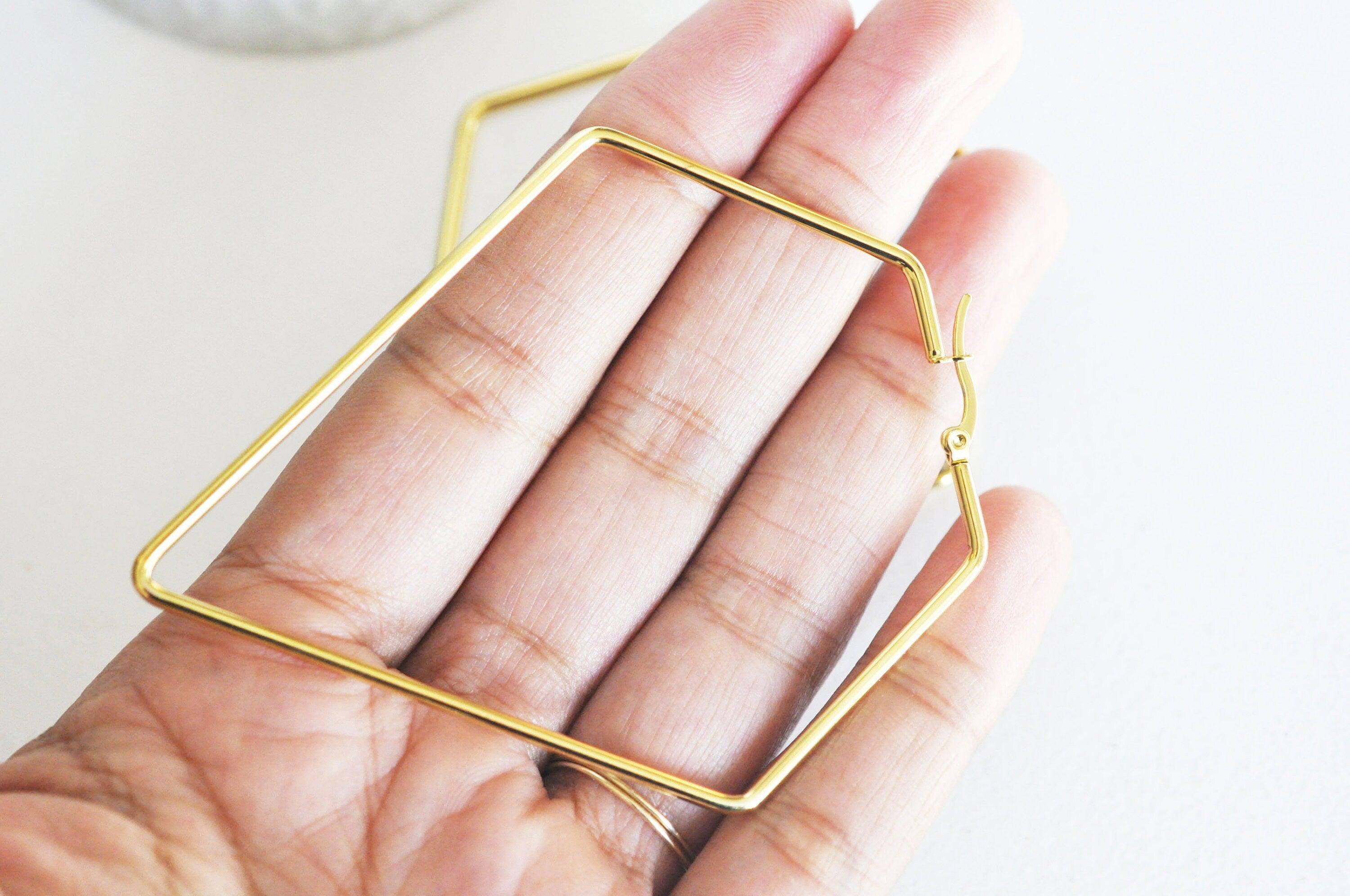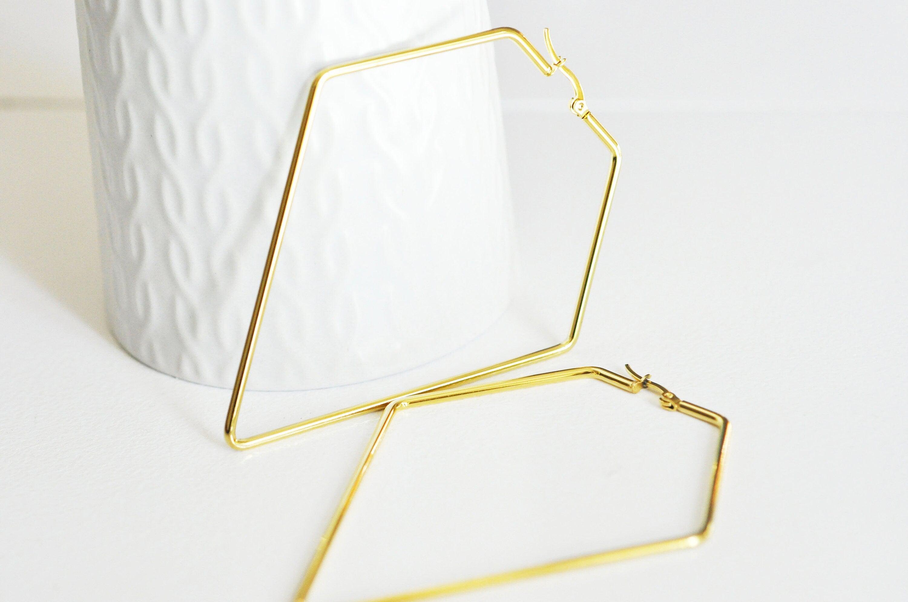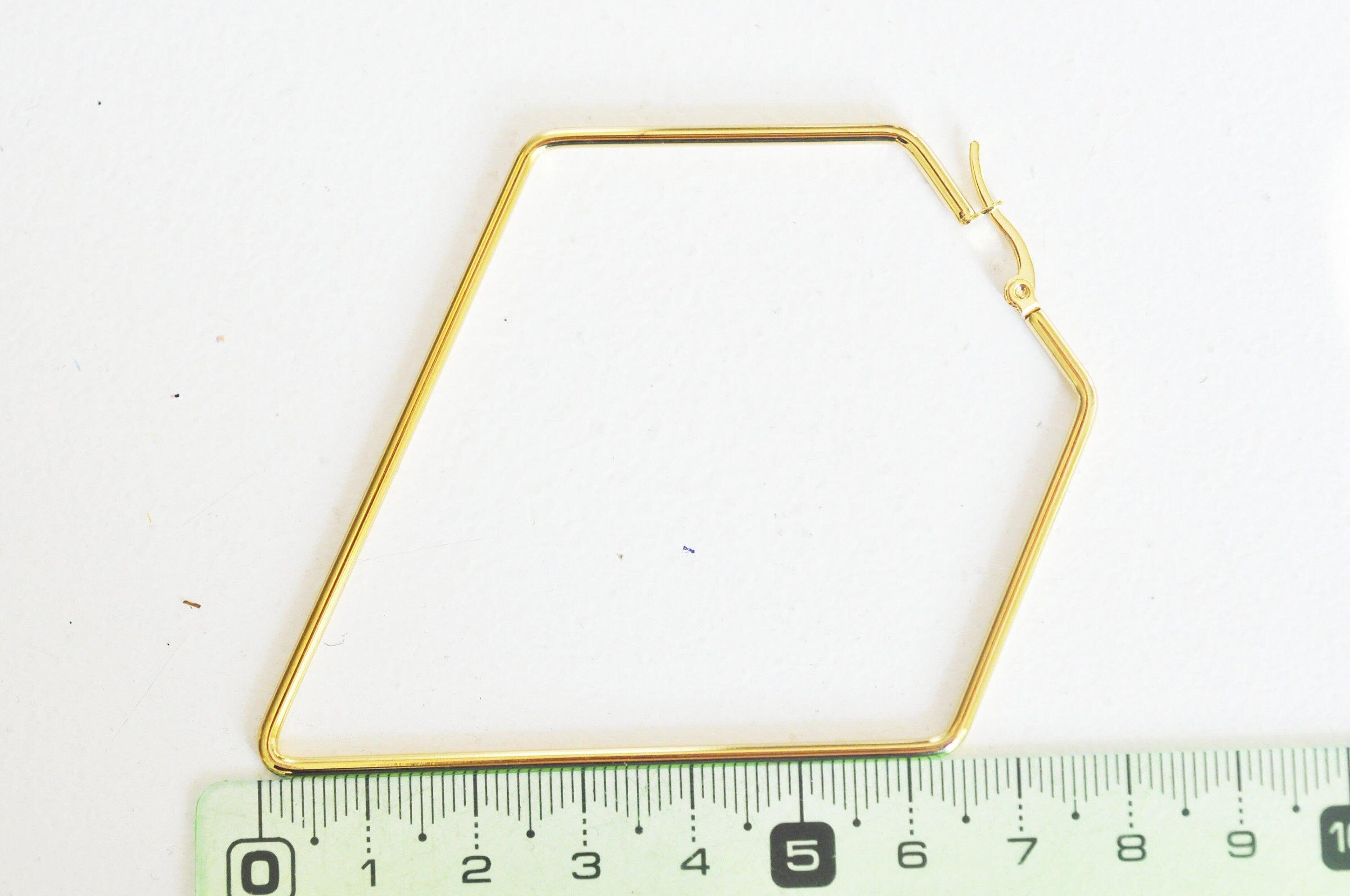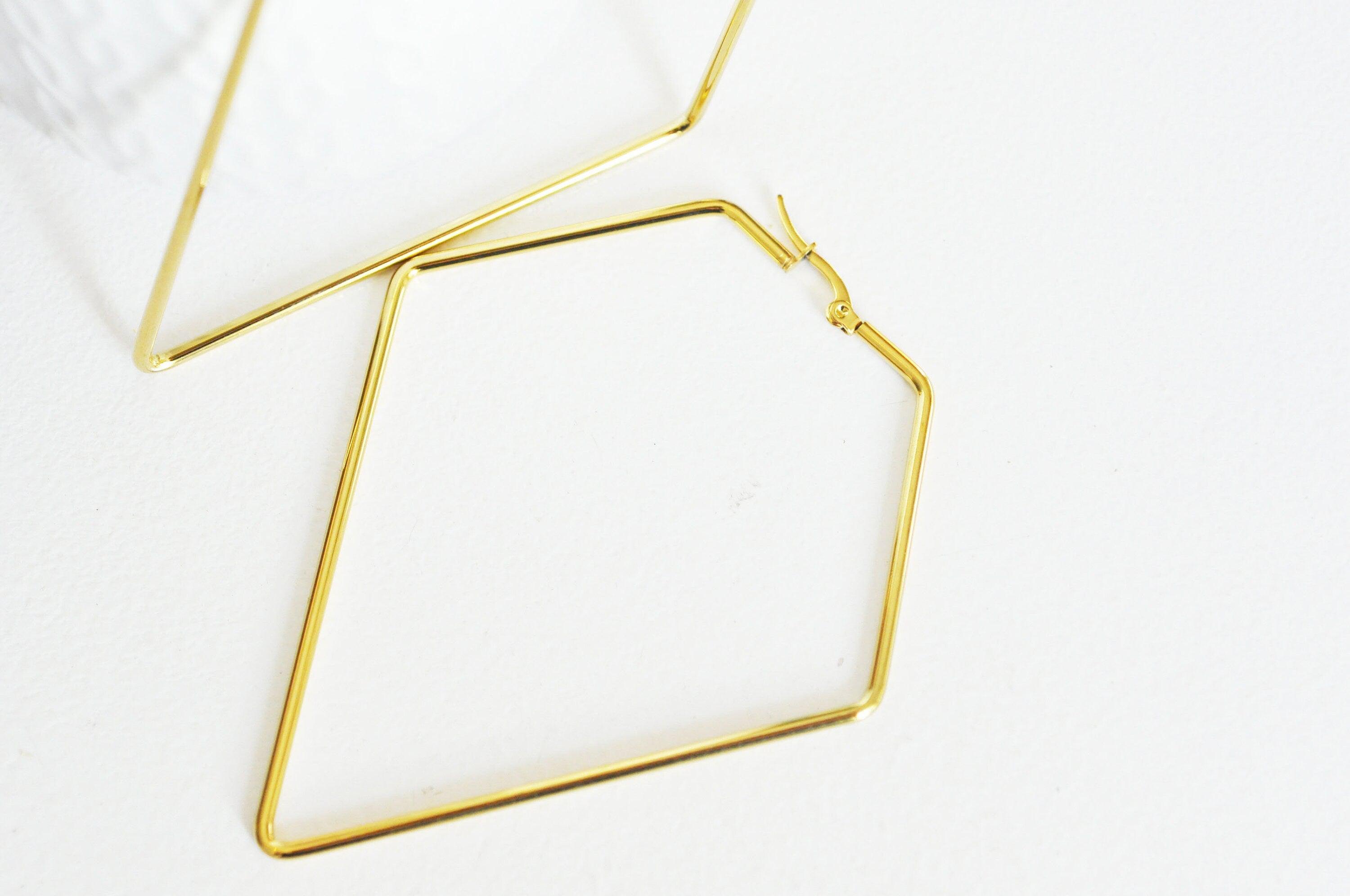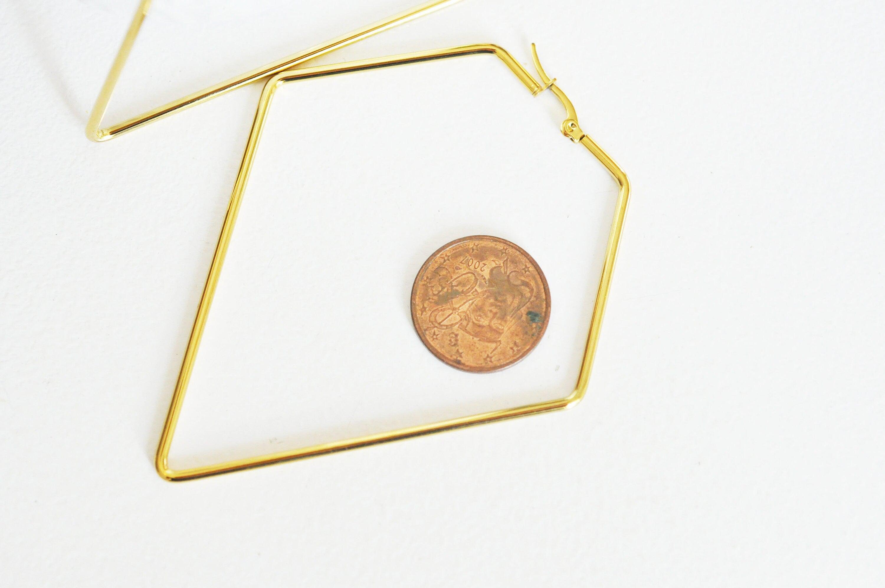 criolla de diamantes geométrica en acero bañado en oro, joyas bañadas en oro, creación de joyas, pendientes de diamantes, sin níquel, par, pendientes de acero, 87 mm, par Pendientes de aro geométricos en acero bañado en oro Se vende en...