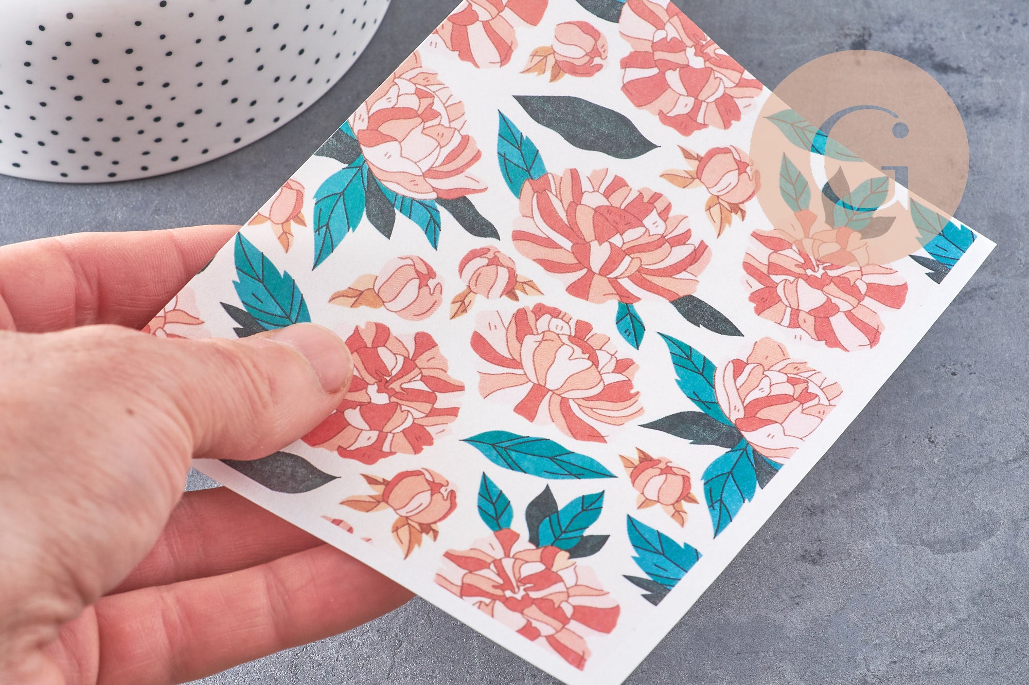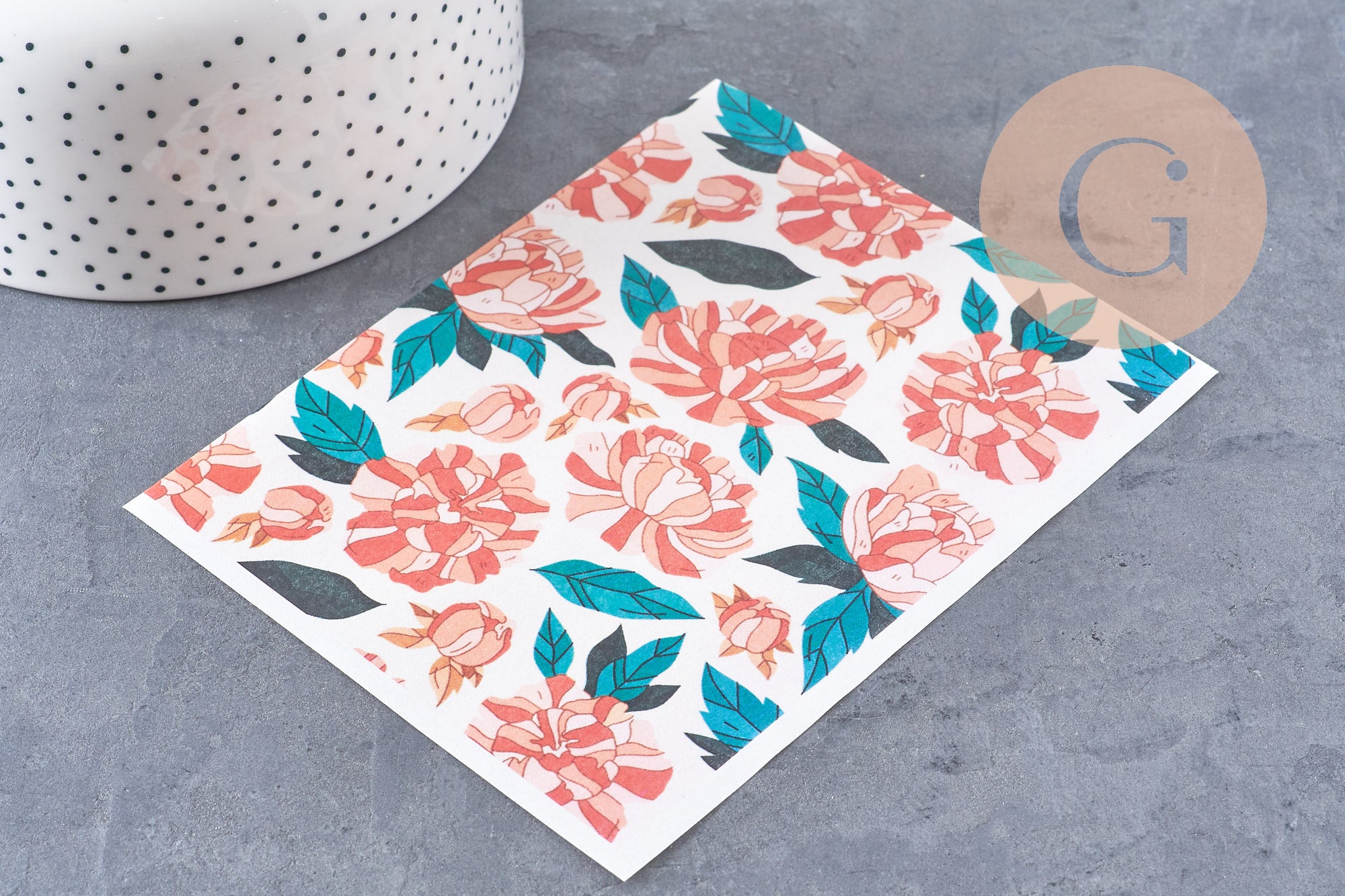 💗Aplica el transfer sobre una pasta blanca o pálida para revelar la intensidad de las flores estilizadas.