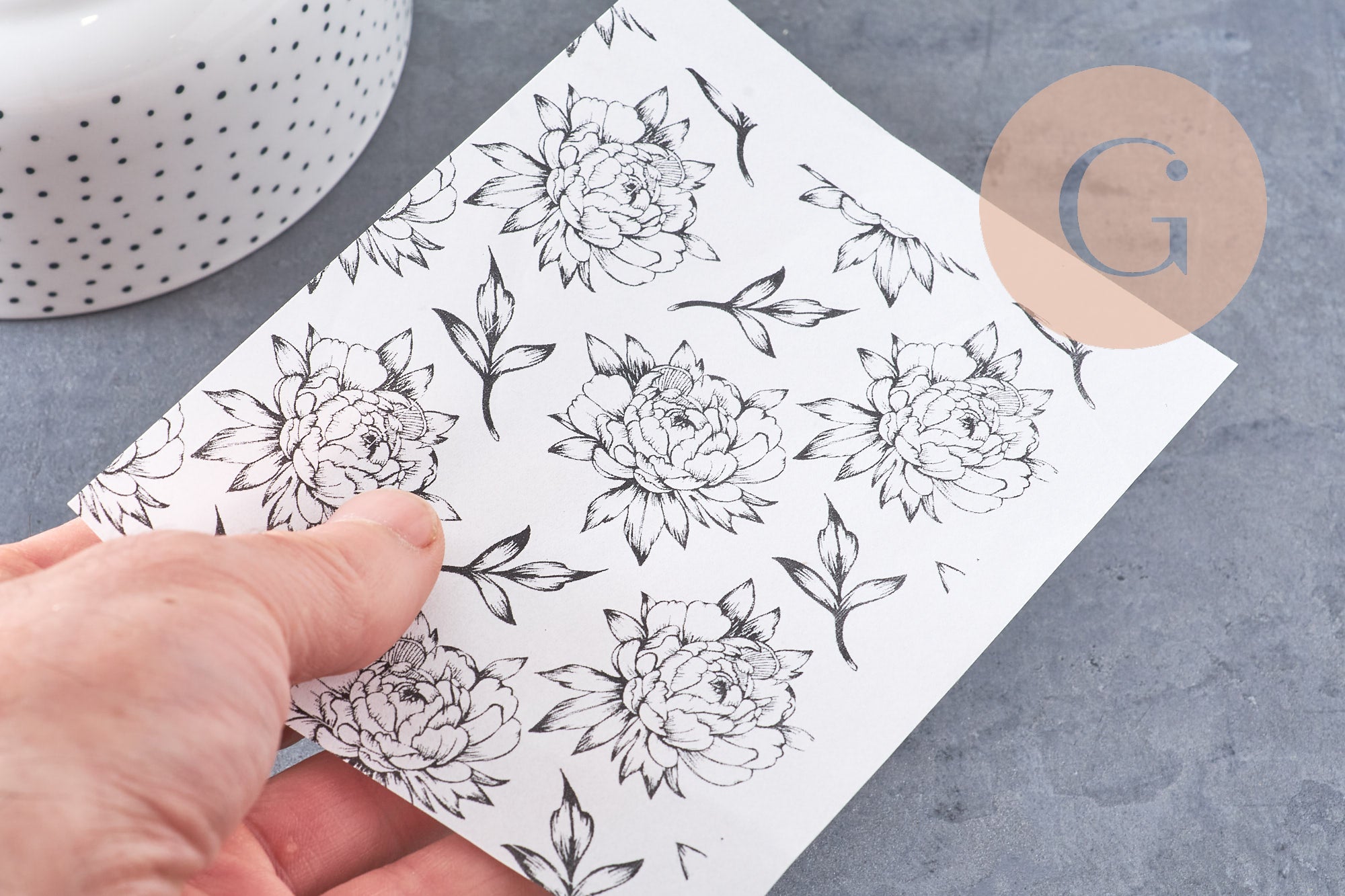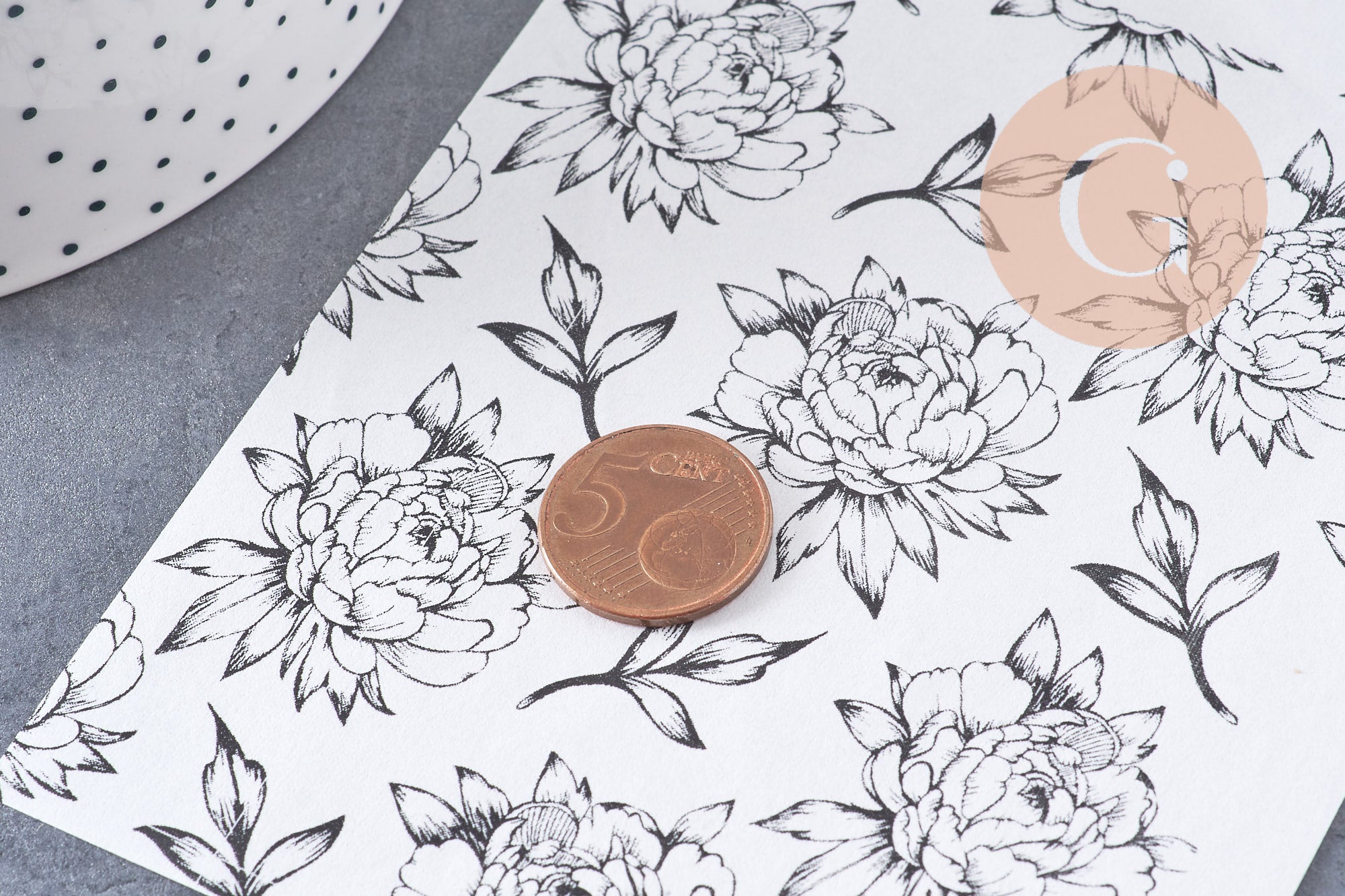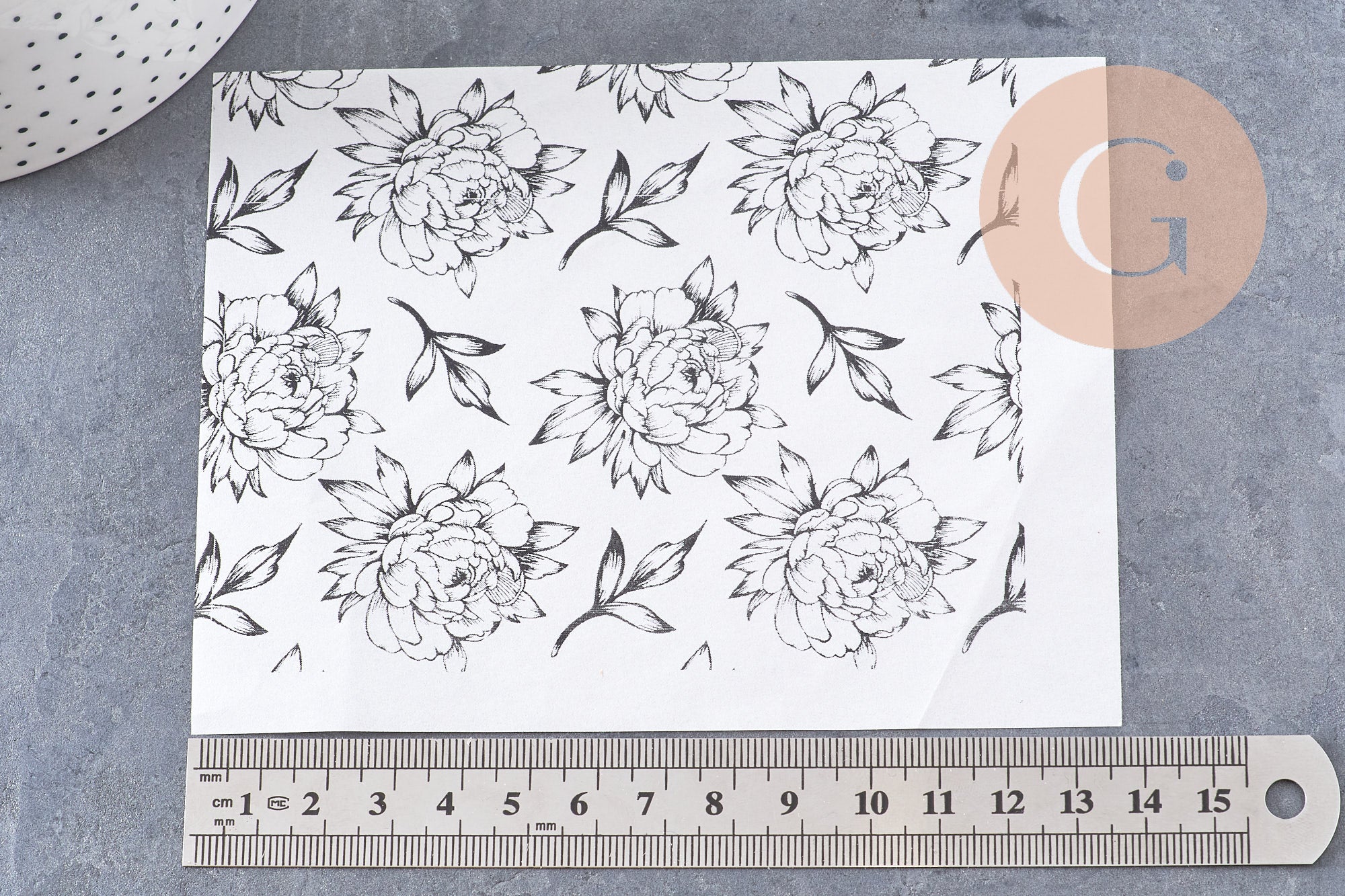 Añade un toque de elegancia atemporal a tus diseños con esta lámina de transferencia con un estilizado estampado floral en blanco y negro . Ideal para joyería femenina y gráfica.