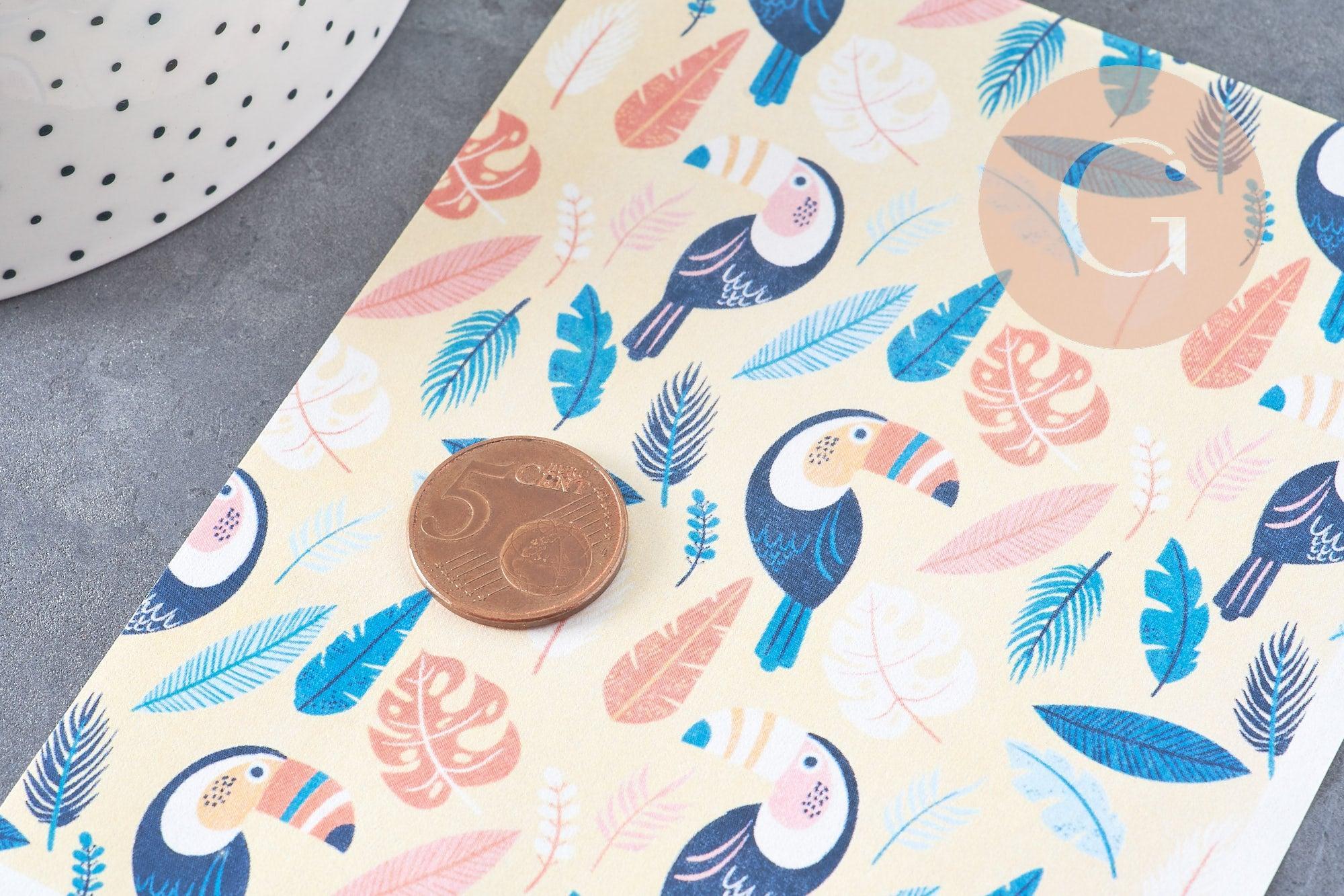 Dale un toque exótico y colorido a tus creaciones con esta lámina de transferencia de arcilla polimérica . Su estampado de tucán sobre fondo amarillo con hojas tropicales aporta brillo y originalidad, perfecto para crear joyería de verano con un toque selvático y soleado.