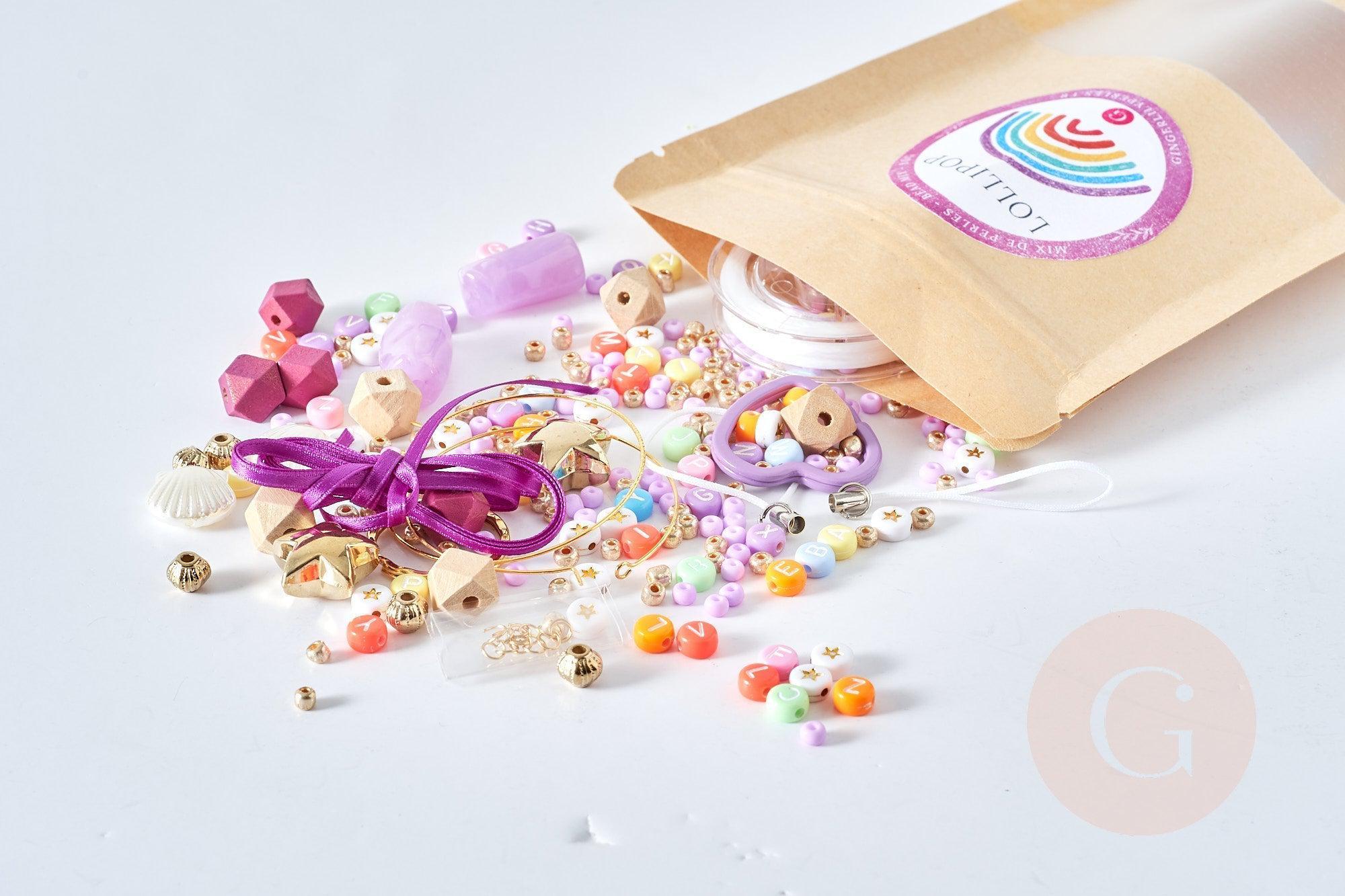 En este sobre descubrirás útiles de bricolaje para realizar magníficas joyas así como diversos accesorios . La bobina de hilo elástico flexible te permitirá crear varias pulseras y collares, para guardar o regalar. También encontrarás elementos para realizar joyas para gafas, joyas para teléfonos e incluso llaveros. Cuentas redondas de plástico, cuentas en forma de letras o mensajes, cuentas de fantasía...