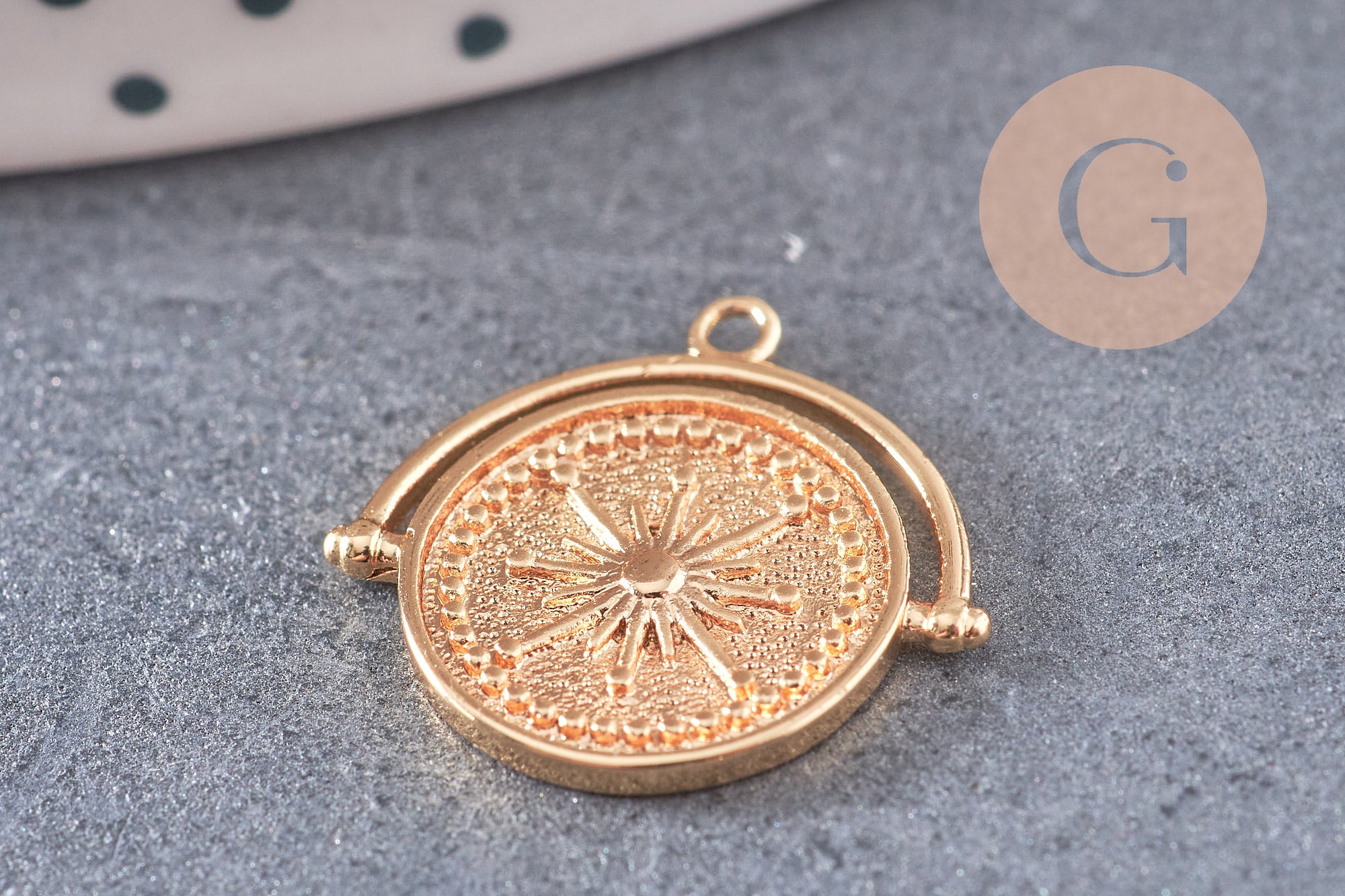 Una bonita medalla redonda en latón bañado en oro de 18k, que representa una brújula con un sol en el centro.