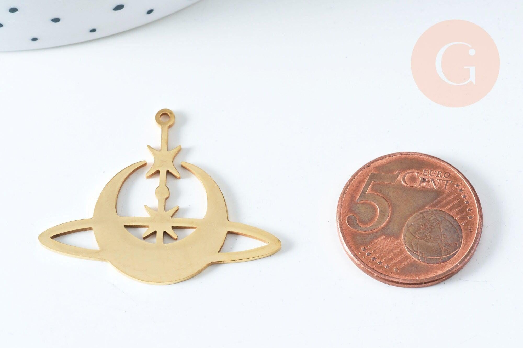 Para tus joyas de tendencia estelar, aquí tienes un sublime colgante en forma de luna invertida y estrellas en acero inoxidable dorado, que puedes adornar con una piedra o perlas.