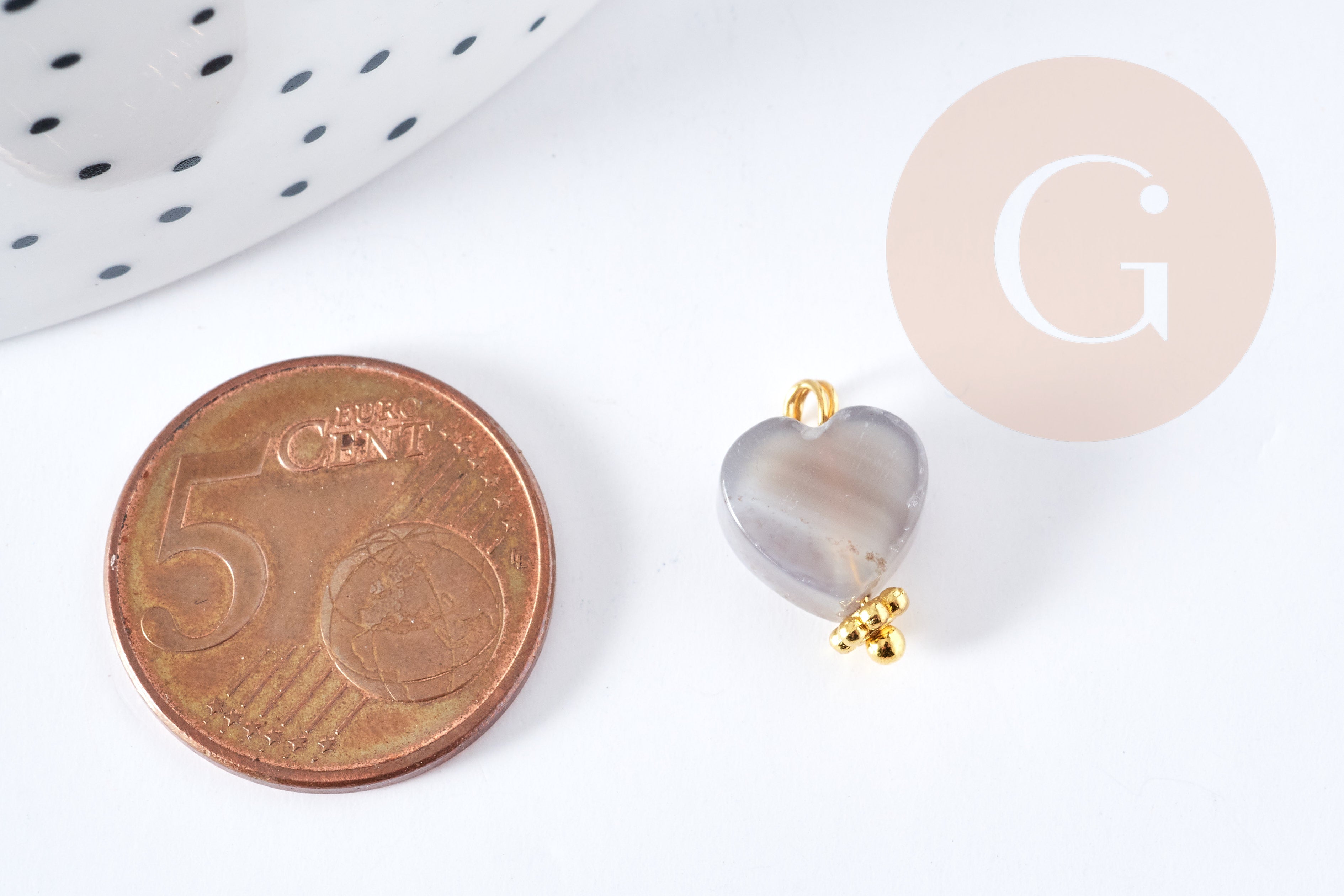 Pendentif cœur agate grise naturelle laiton doré 15.5mm, x1 (G8645)