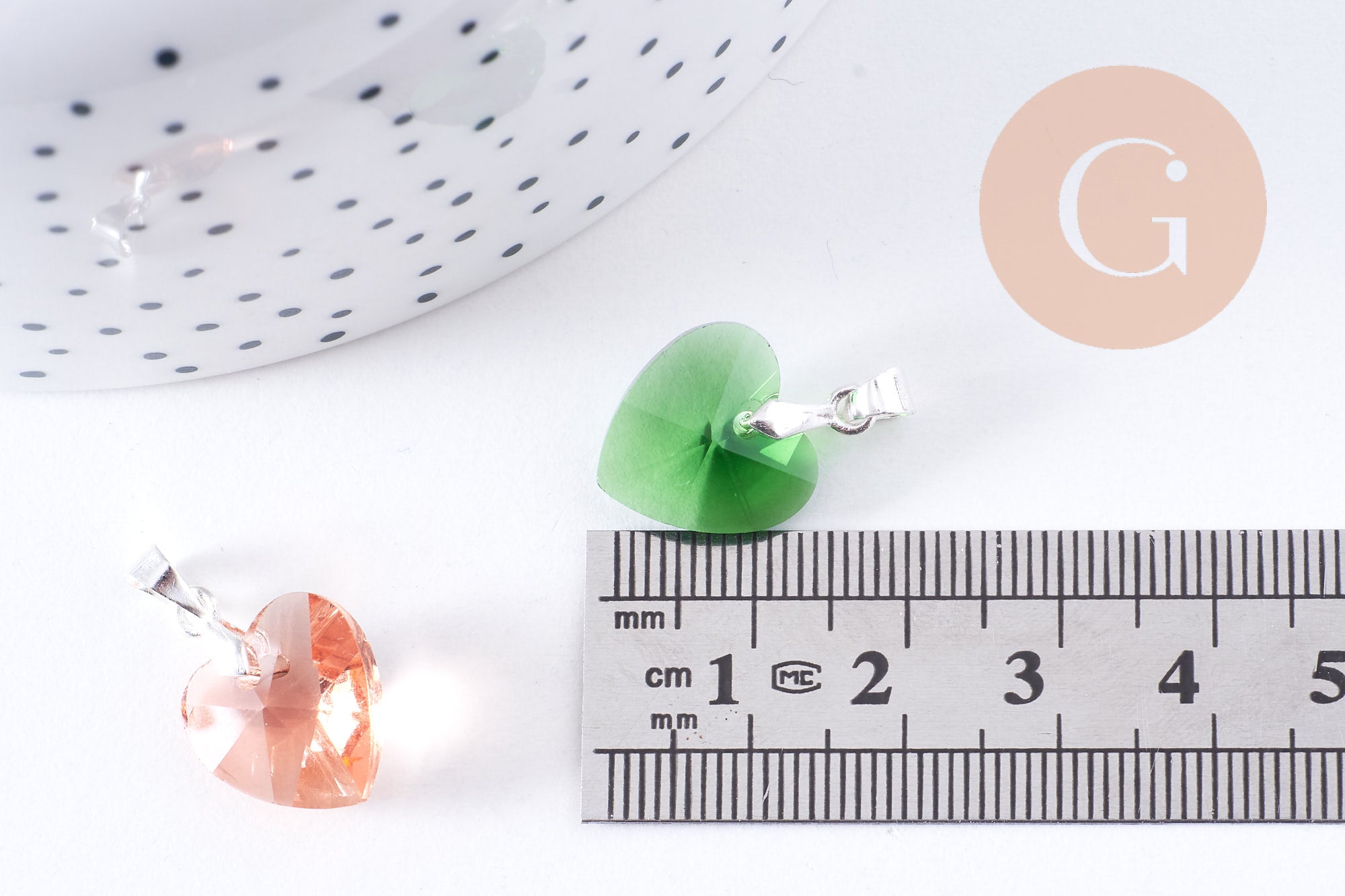 Dale un toque de color y luz a tus creaciones con este bonito colgante de corazón facetado . Hecho de vidrio de colores con vibrantes reflejos, está montado sobre un asa de hierro plateado lista para usar.