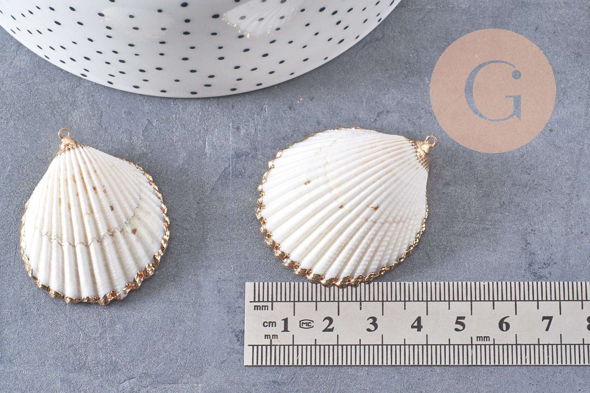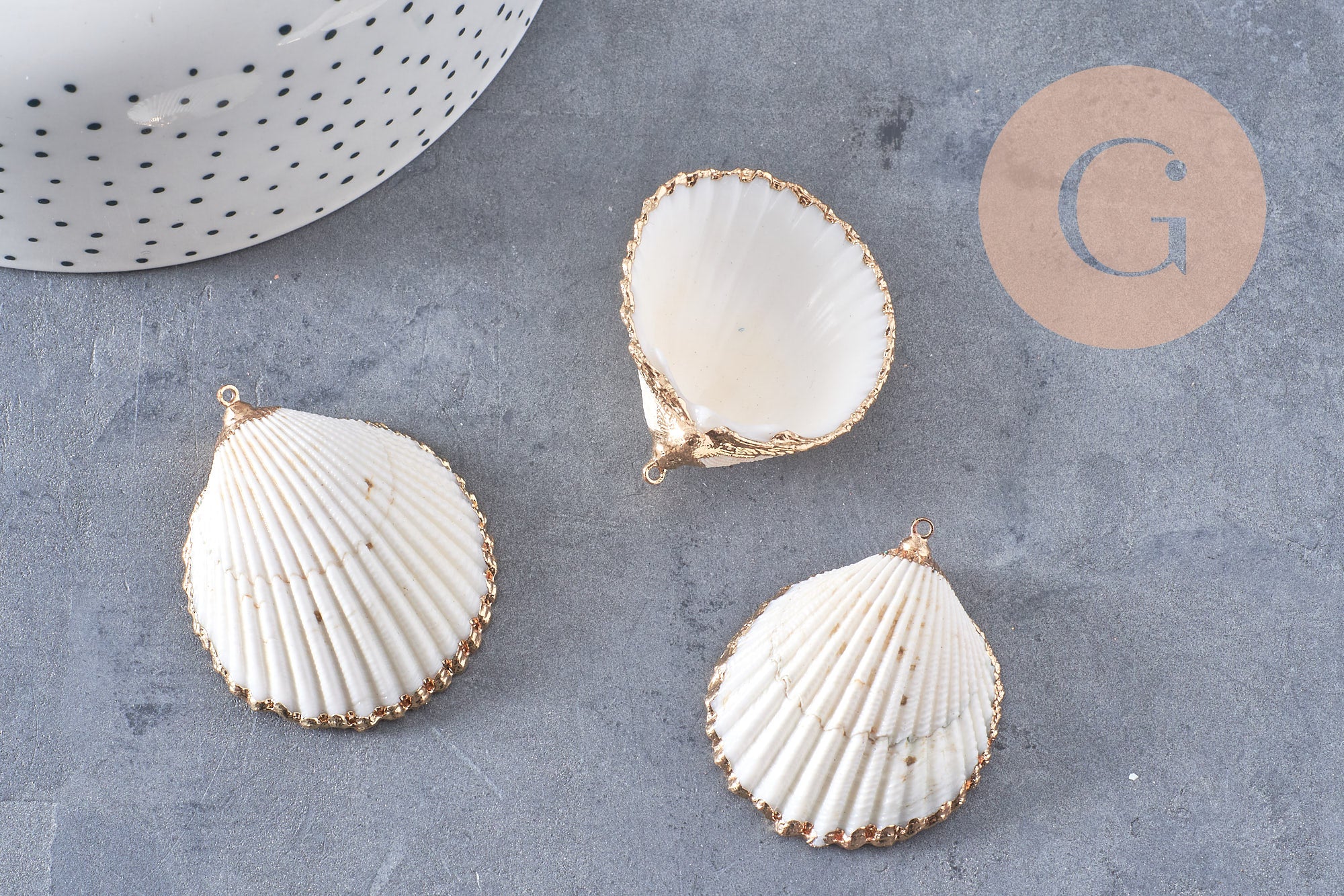 • Materiales: concha natural y latón dorado