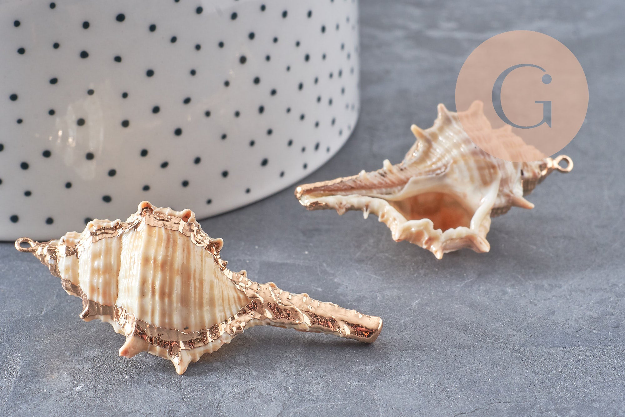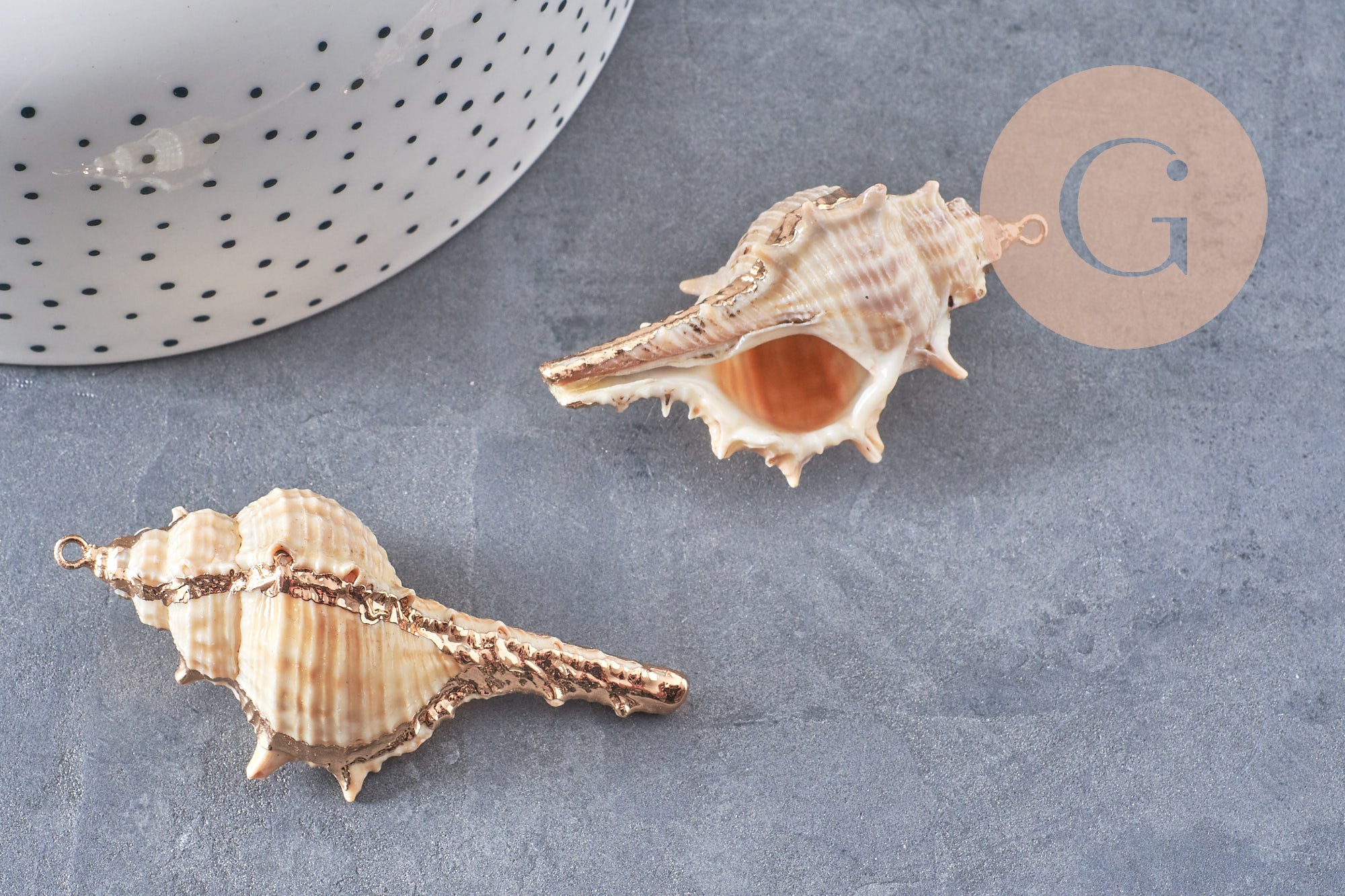 Añade un toque exótico a tus creaciones con este colgante de caracola dorada natural. Cada pieza, cuidadosamente seleccionada, está bañada en oro en los bordes para un acabado elegante y luminoso. Es el elemento perfecto para crear joyas de verano , inspiradas en el mar y la naturaleza.