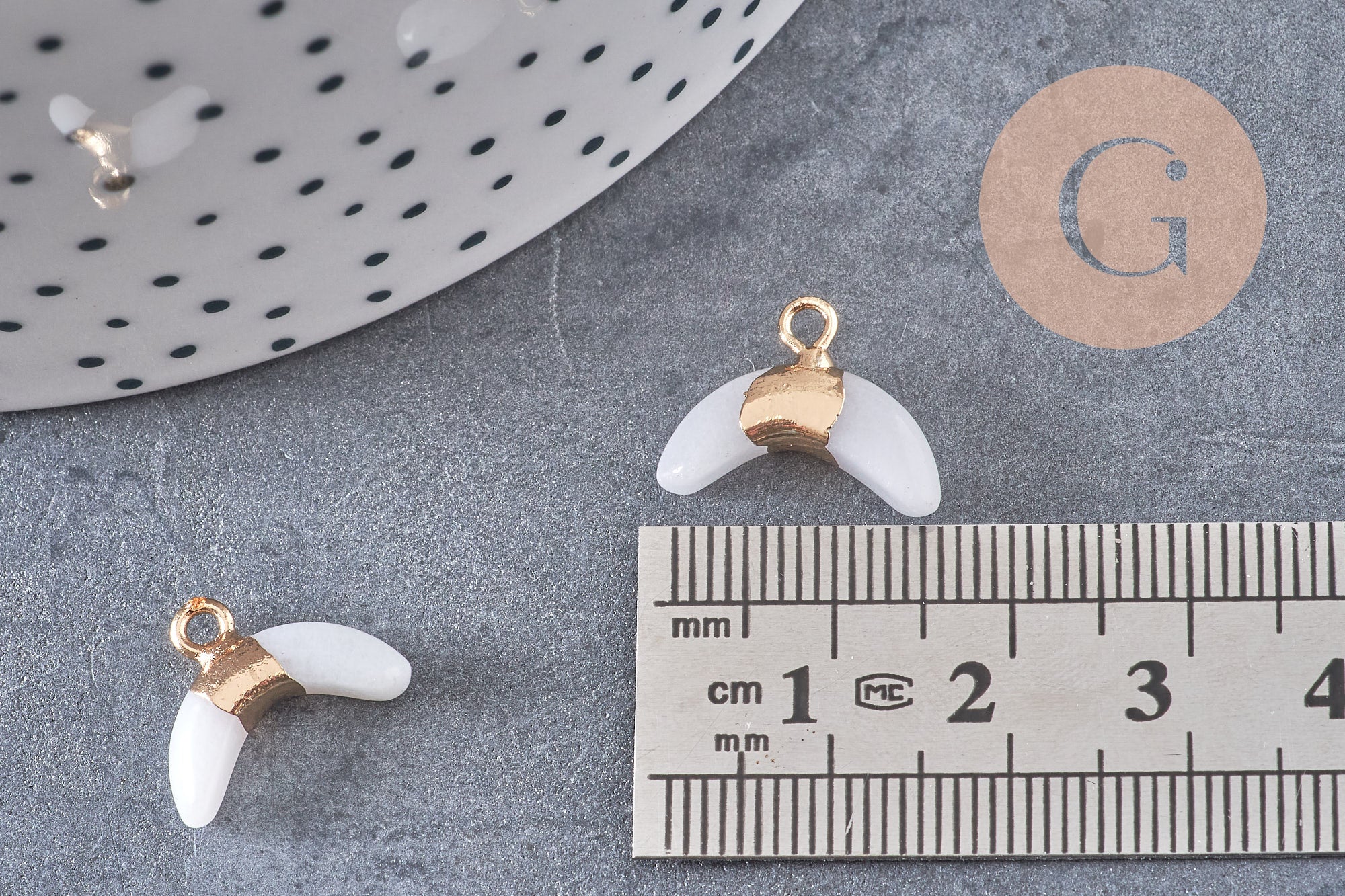 Enamórate de este colgante de jade blanco natural, tallado en forma de cuerno/media luna y montado sobre una elegante base de latón bañado en oro. Una joya de moda que podrás incorporar a tus creaciones y darle un toque místico y mineral.