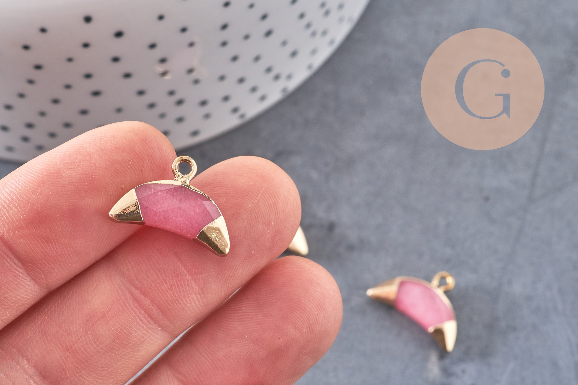 Déjate seducir por este pequeño colgante de jade natural facetado teñido de rosa con su soporte dorado en forma de media luna dorada en las puntas de la piedra.