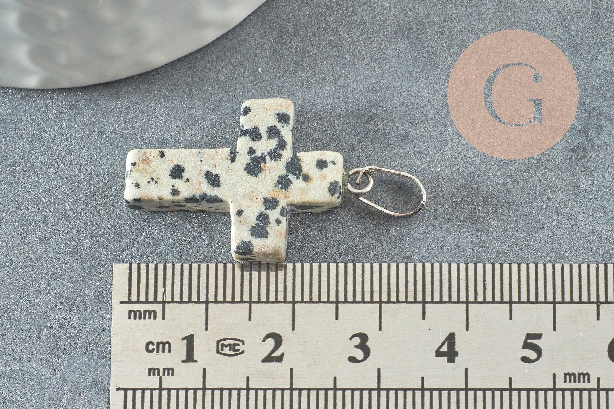 Pendentif croix jaspe dalmatien naturel acier inoxydable 29mm,pendentif pierre, support argent, création bijoux, x1 (G1695)