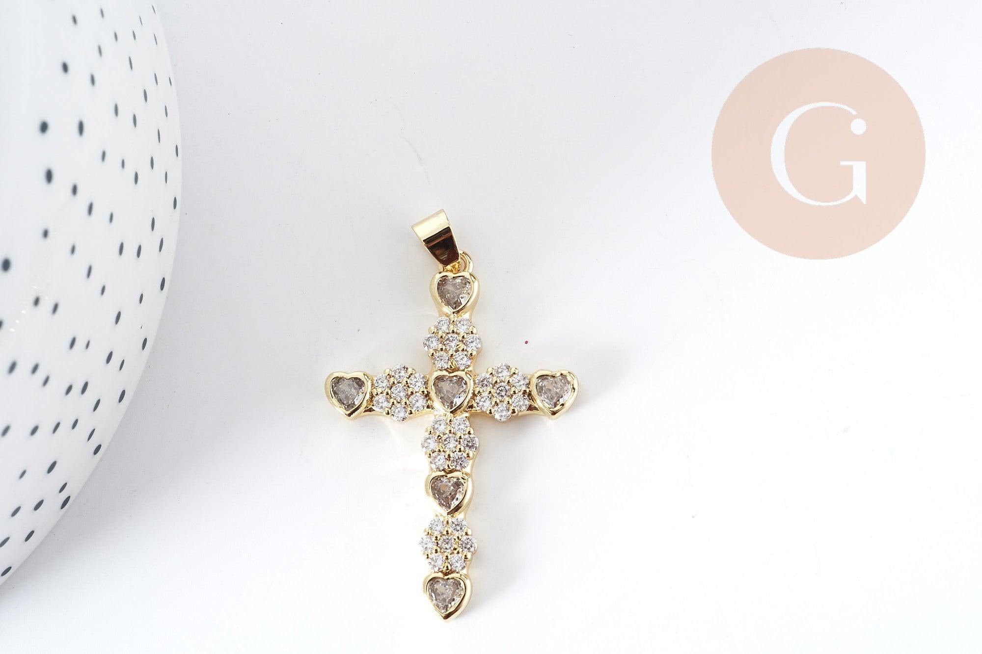 Déjate seducir por este colgante en forma de cruz de latón bañado en oro libre de níquel y cadmio y compuesto por circonitas blancas iridiscentes.
