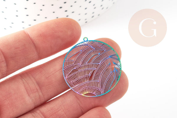 Colgante filigrana estampado hoja de acero multicolor, Colgante muy fino y ligero para creación de joyas, 31,5x30, Lote de 2,